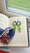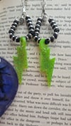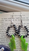 These electrifying beauties feature UV-bright neon green resin lightning bolts that demand attention, dangling from sleek silver-plated hoops. Accented with bold black clay beads and silver-plated dividers, they’re the perfect balance of chaos and cool.