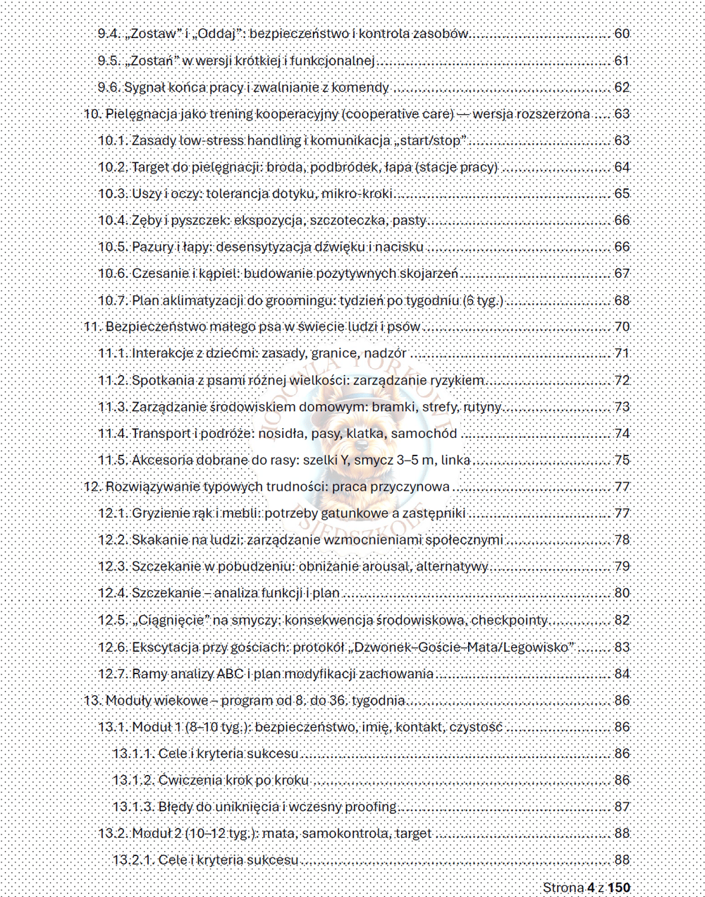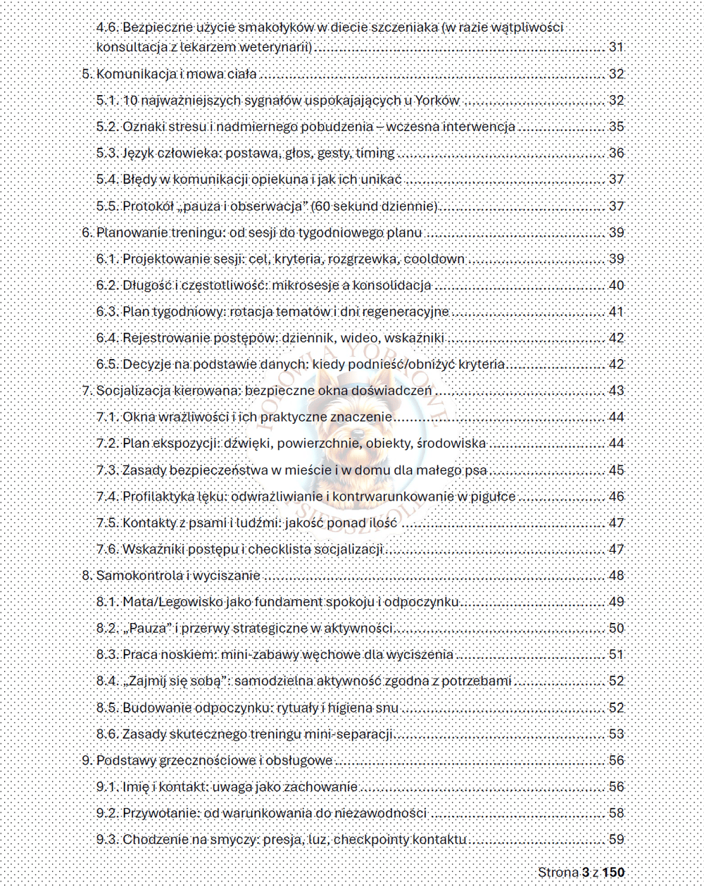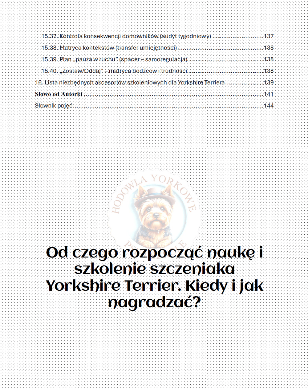 Yorkshire Terrier to pies o wielkim sercu w małym ciele. Jego uważność, żywiołowość i gotowość do współpracy potrafią zachwycić, ale wymagają też od nas odpowiedzialności. Dlatego od pierwszych stron konsekwentnie prowadziłam Cię przez dobrostan, emocje i higienę nauki, zanim weszliśmy w techniczne aspekty kształtowania zachowań. Wszystko po to, by nauka była opłacalna, zrozumiała i — co równie ważne — etyczna. Bez bólu, bez strachu, z prawem do rezygnacji i czytelnym „końcem” pracy.