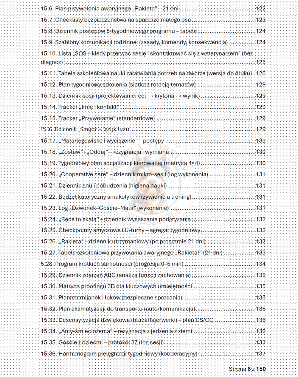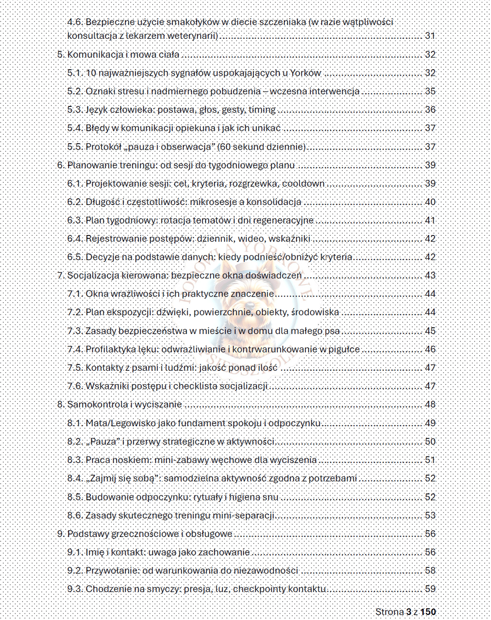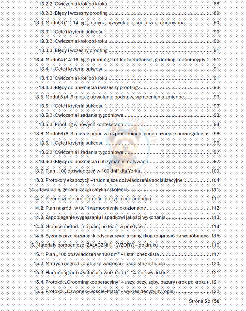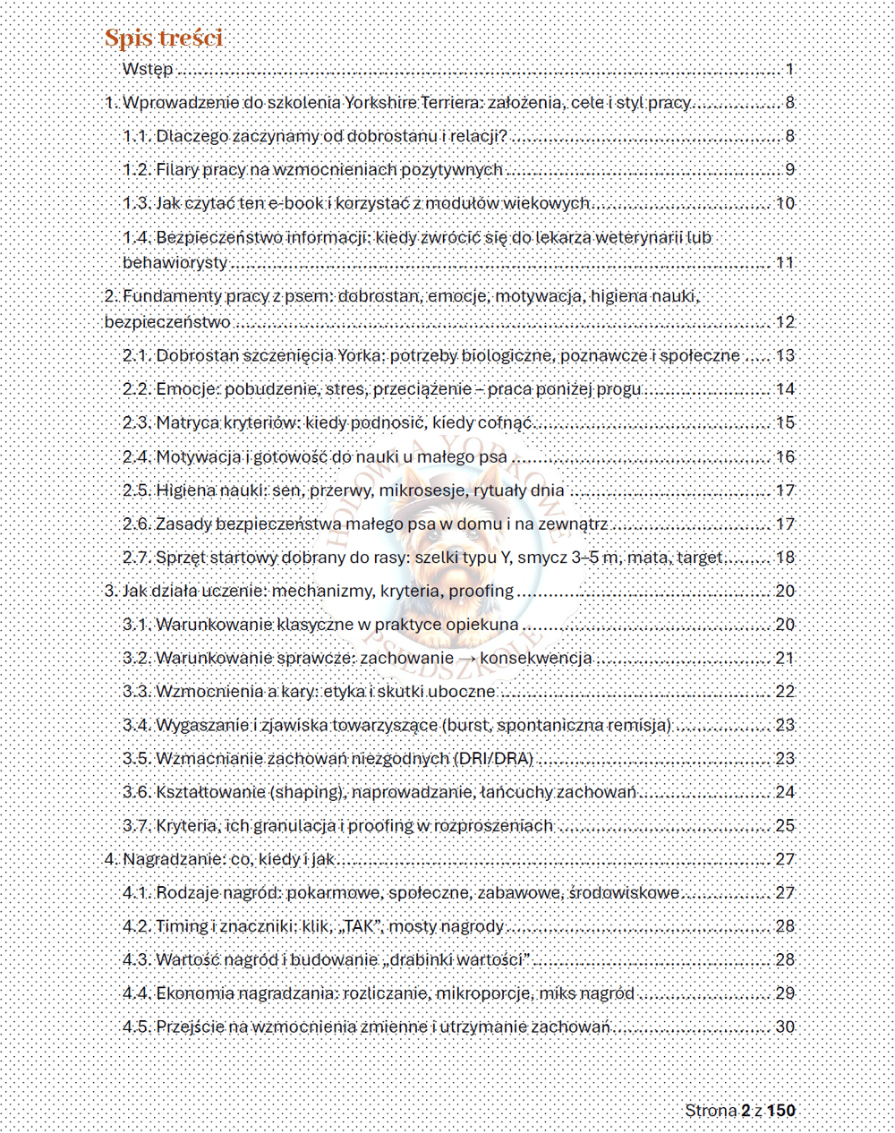 Yorkshire Terrier to pies o wielkim sercu w małym ciele. Jego uważność, żywiołowość i gotowość do współpracy potrafią zachwycić, ale wymagają też od nas odpowiedzialności. Dlatego od pierwszych stron konsekwentnie prowadziłam Cię przez dobrostan, emocje i higienę nauki, zanim weszliśmy w techniczne aspekty kształtowania zachowań. Wszystko po to, by nauka była opłacalna, zrozumiała i — co równie ważne — etyczna. Bez bólu, bez strachu, z prawem do rezygnacji i czytelnym „końcem” pracy.