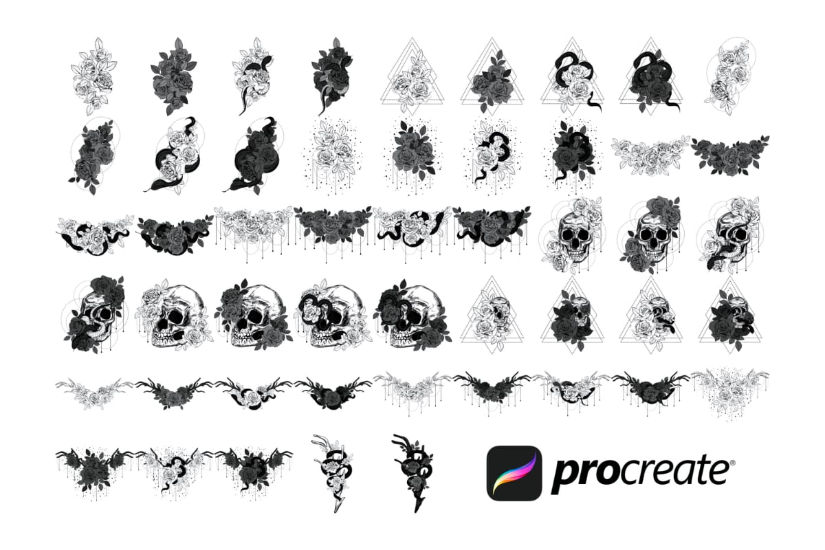 Gothic Vintage Tattoos Set 1 Procreate Brush Stamps, 50 Flash Tattoos