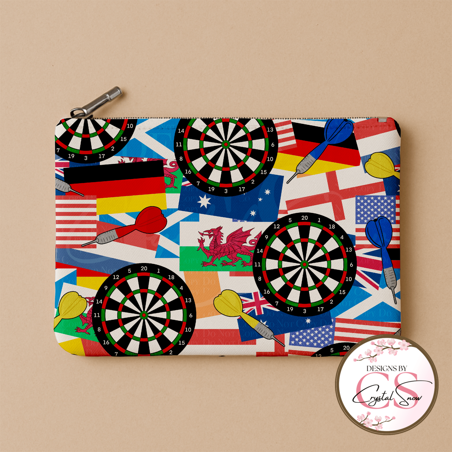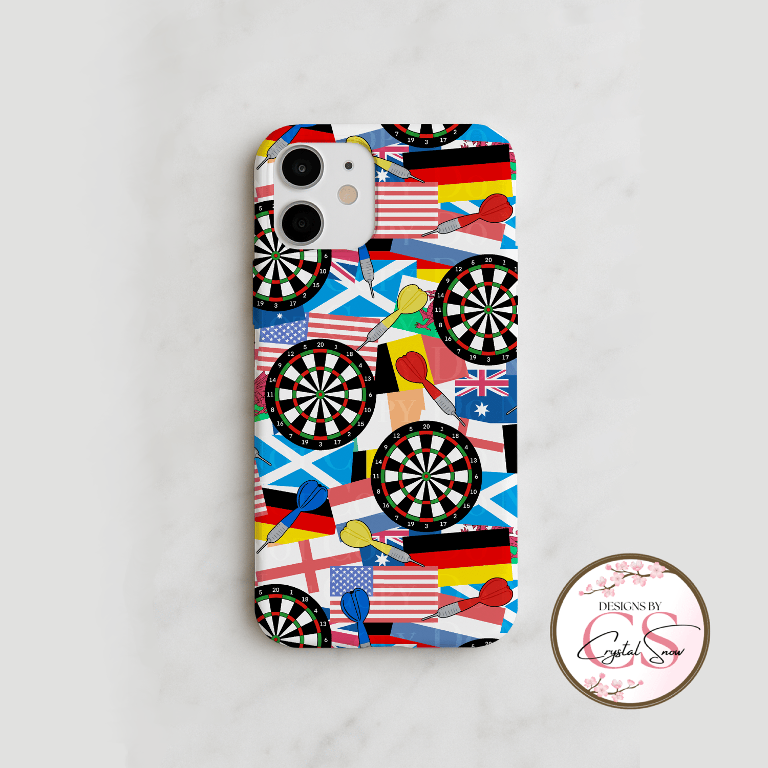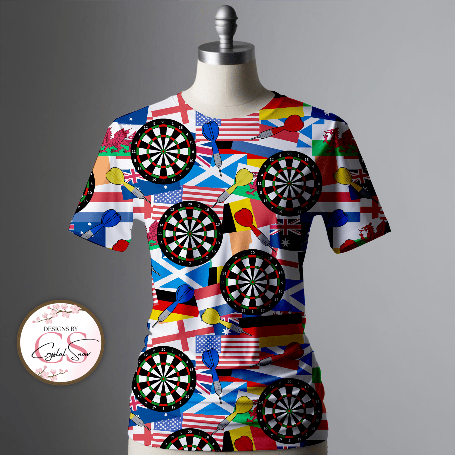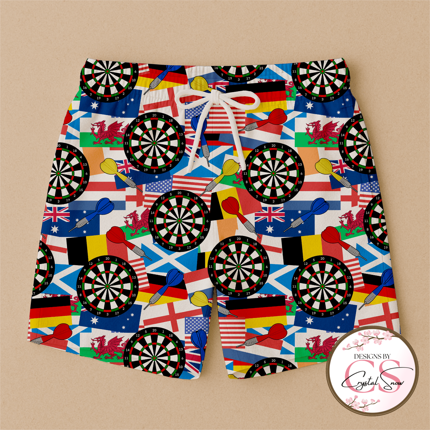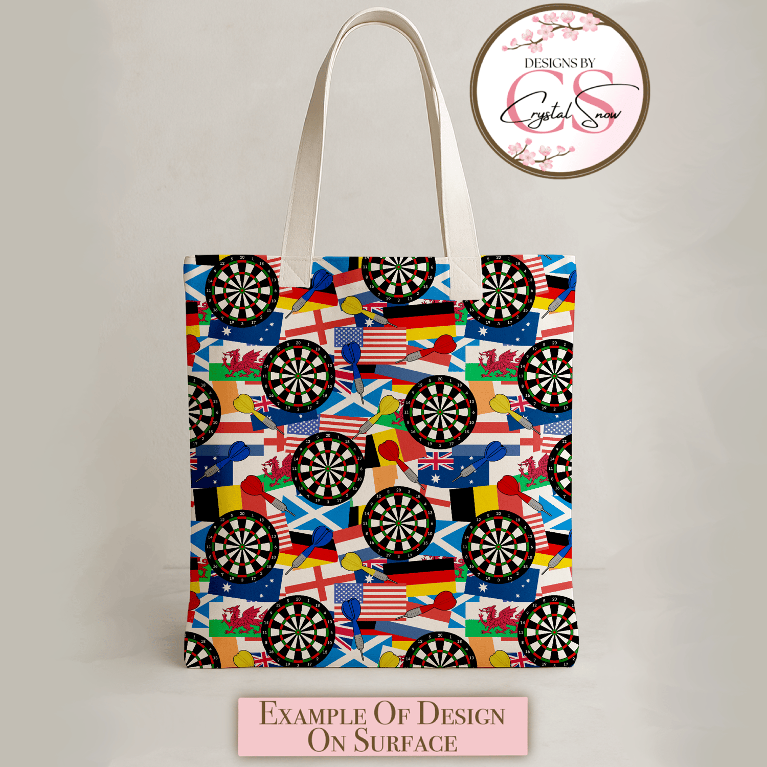 This hand-drawn World Tour Darts seamless pattern features dartboards layered over international flags including the USA, UK, Scotland, Germany, Wales, Australia, Belgium, and more — creating a bold, high-energy global darts design.