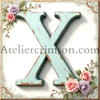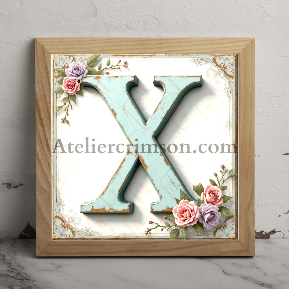 The letter X shabby chic blue a work of art in soft pastel blue. These elegant characters, reminiscent of weathered painted wood, stand out against a delicate off-white background with subtle floral accents. Perfect for vintage-inspired home decor, DIY projects, or creating unique, personalized gifts with a touch of timeless elegance.