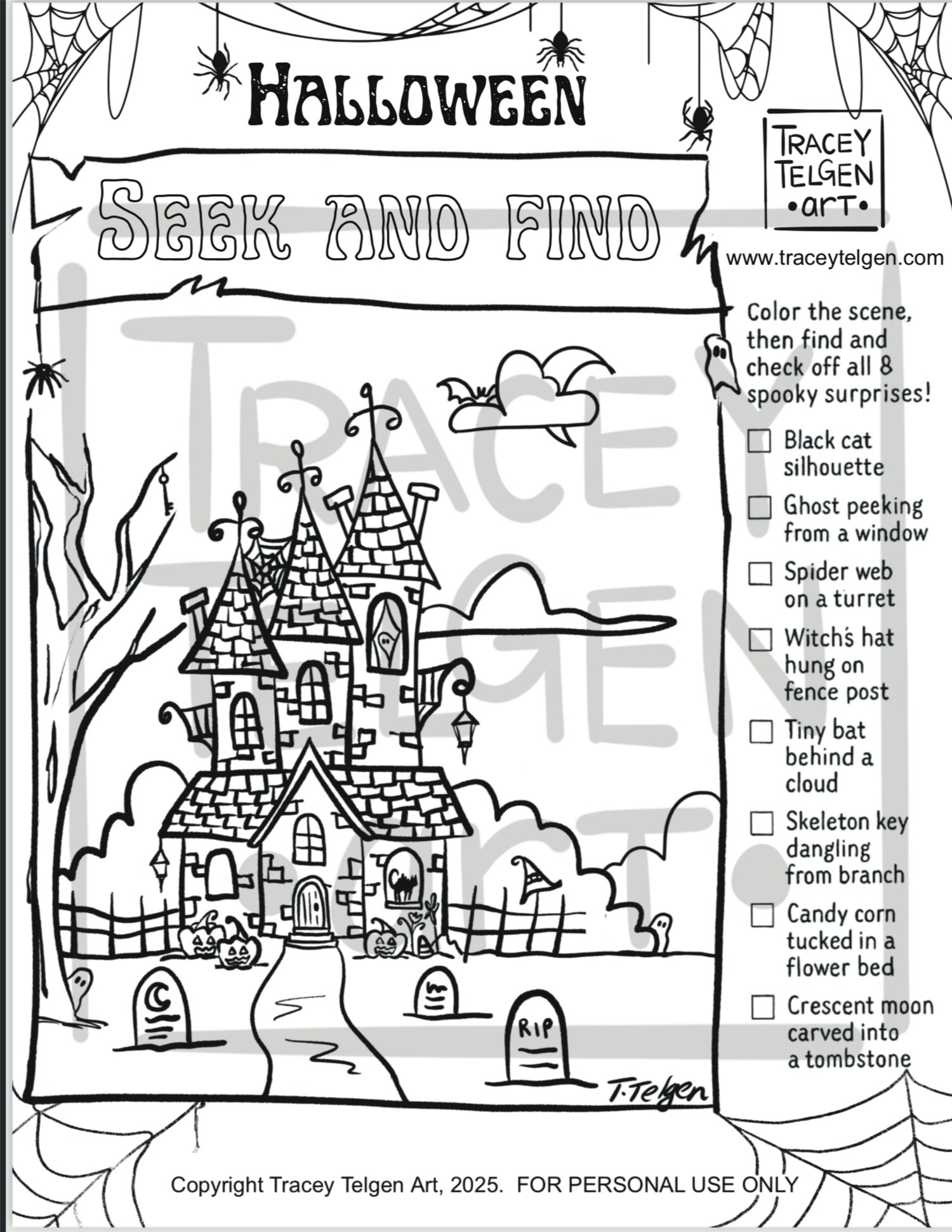 Kids (and grown-ups!) can color the scene and search for 8 hidden Halloween-themed items—from a ghost in the window to a crescent moon carved into a tombstone.