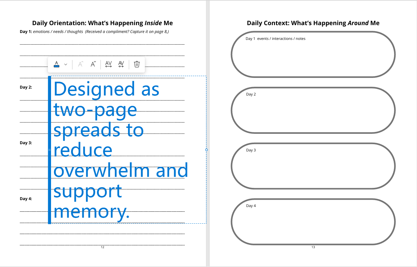 This journal was designed to be printed and used as two-page spreads, like a physical book.