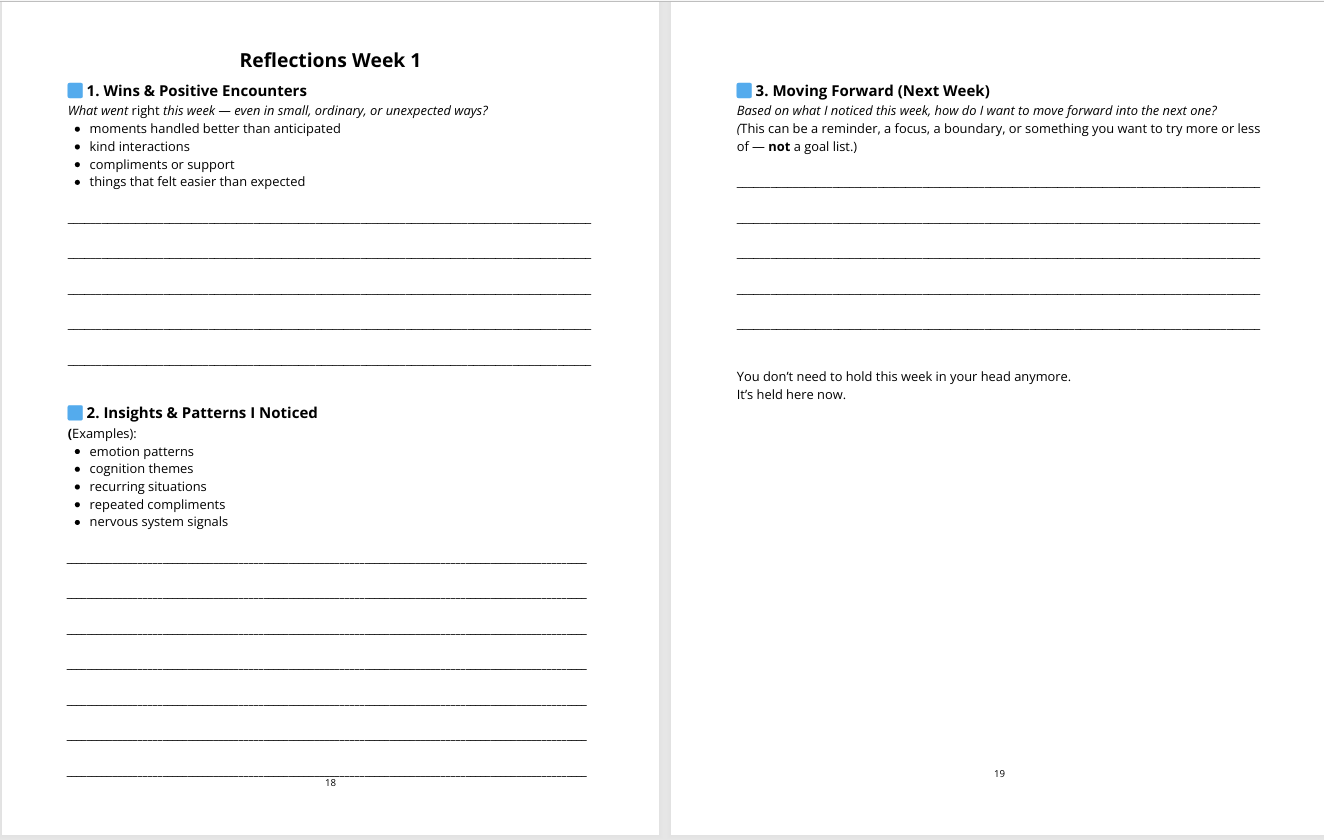- Weekly reflections that reveal patterns and perspective