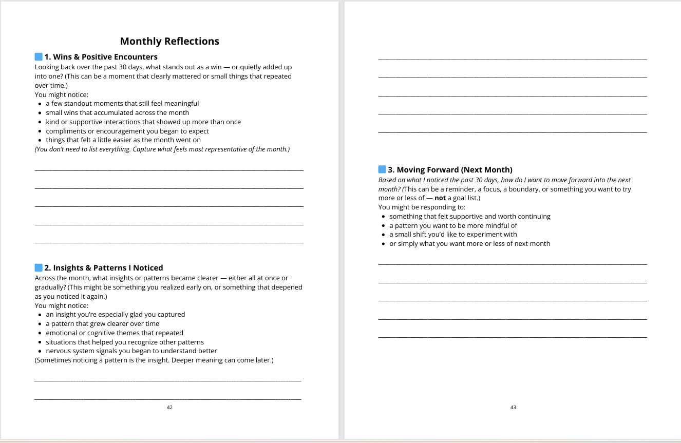 Before each first-time experience — your first weekly reflection, your first monthly reflection, and each optional bonus — the journal includes gentle two-page orientation spreads that explain: