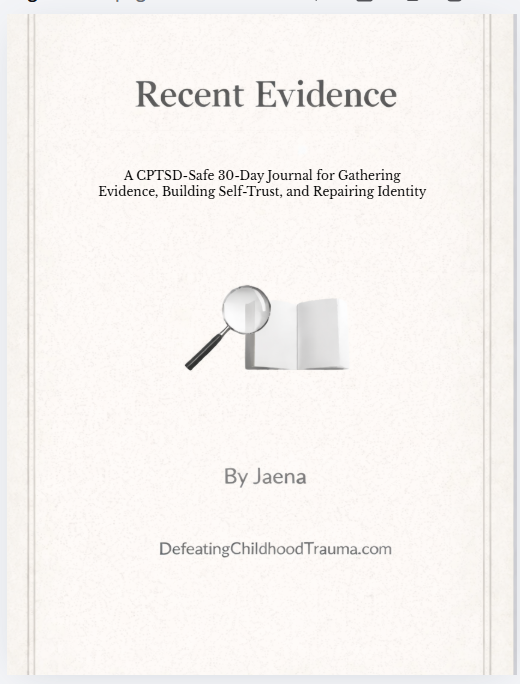 Recent Evidence is a CPTSD-safe 30-day journal designed to help you gather proof of what’s actually happening — not just what trauma tells you is happening.