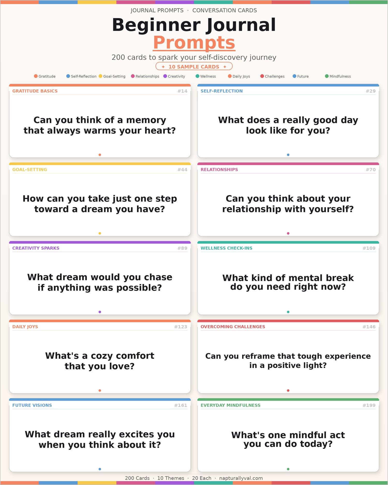 This thoughtfully designed deck of conversation cards helps you overcome blank-page anxiety and unlock your thoughts with ease. Whether you're building a daily journaling habit, working on self-growth, or seeking mental clarity, these prompts guide you step-by-step into deeper awareness and intentional living.