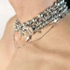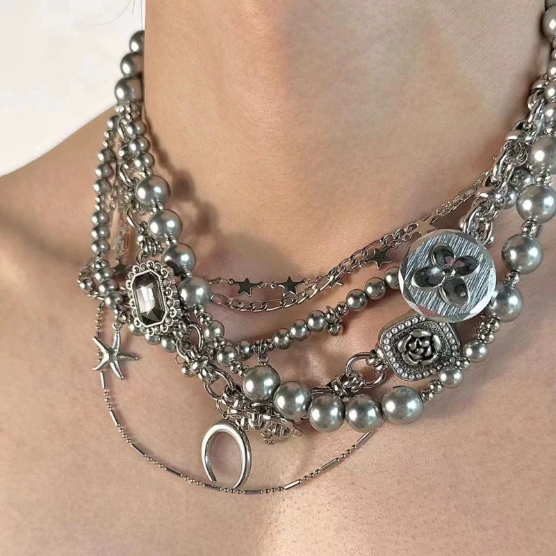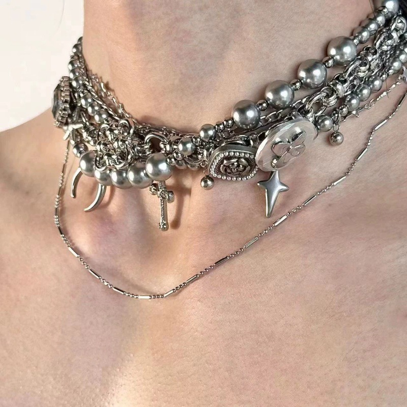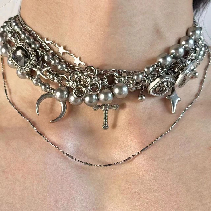 Y2K punk discord silver pearl crescent titanium steel multi-layered necklace choker