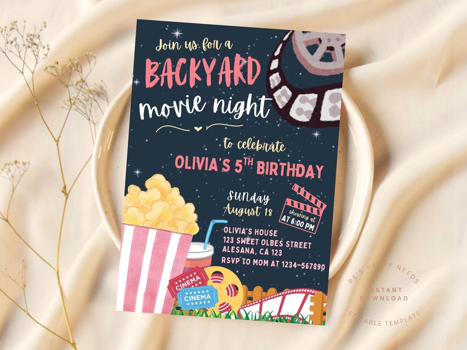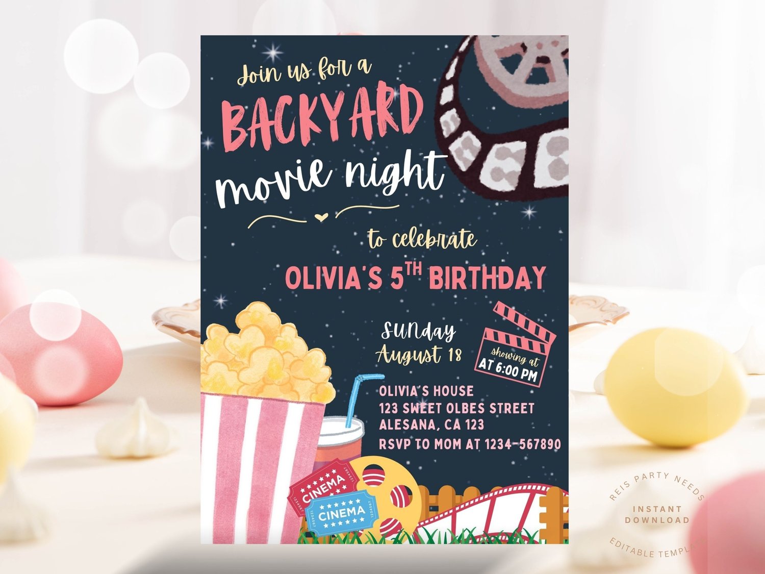 Movie Night Birthday invitation, for girl, pink, Movie Night Birthday Party invitation, Editable Movie Night Birthday, Backyard Movie Night
