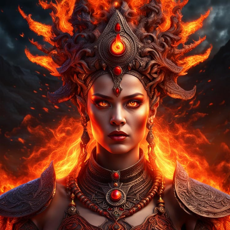 Unleash the fiery power of the "Majestic Fire Sorceress Queen," a photorealistic digital portrait that captures the intense gaze and commanding presence of a sorceress queen within the blazing confines of an Inferno Temple. This stunning artwork showcases the fire sorceress queen with glowing red eyes, exuding an aura of majesty and raw power.
