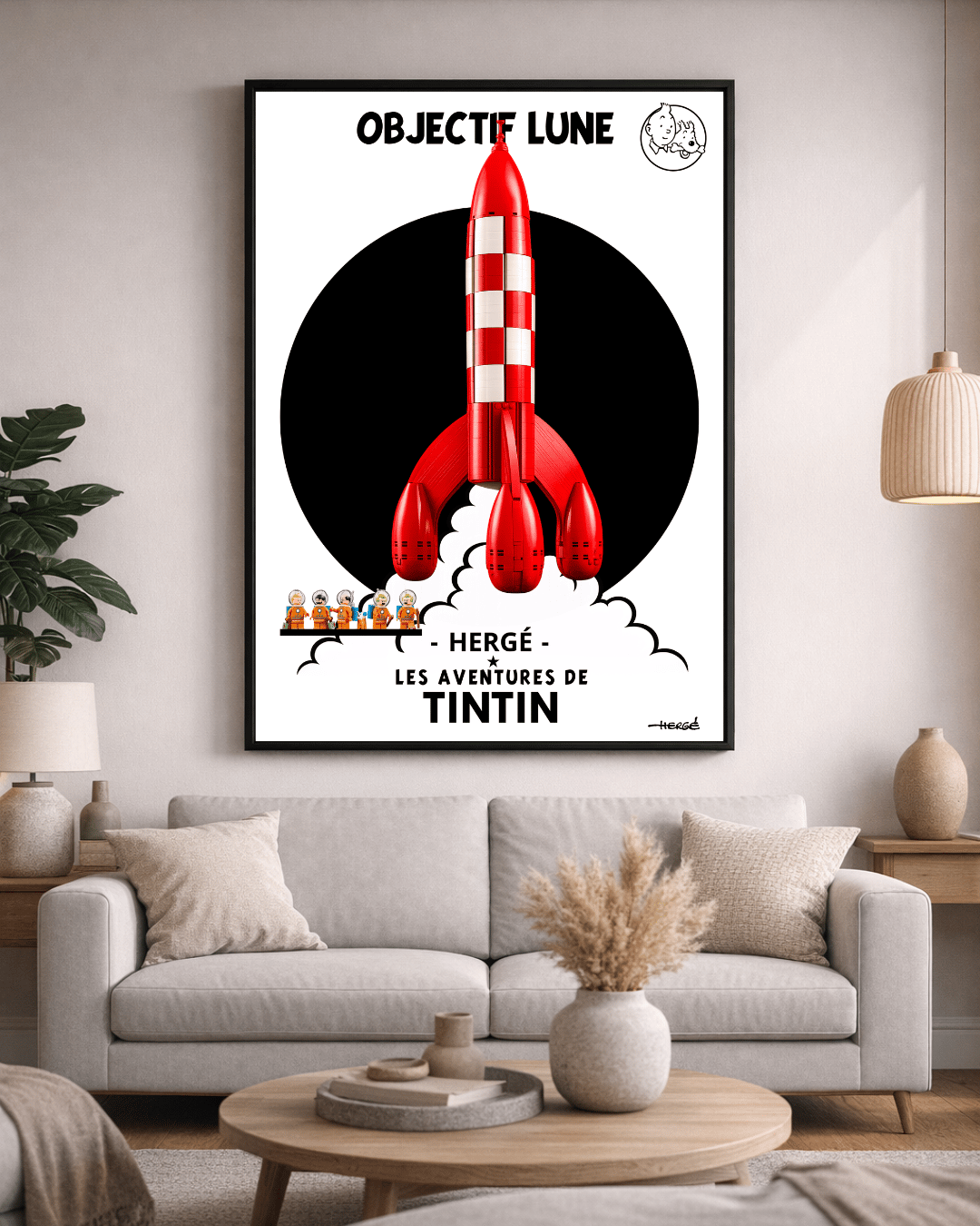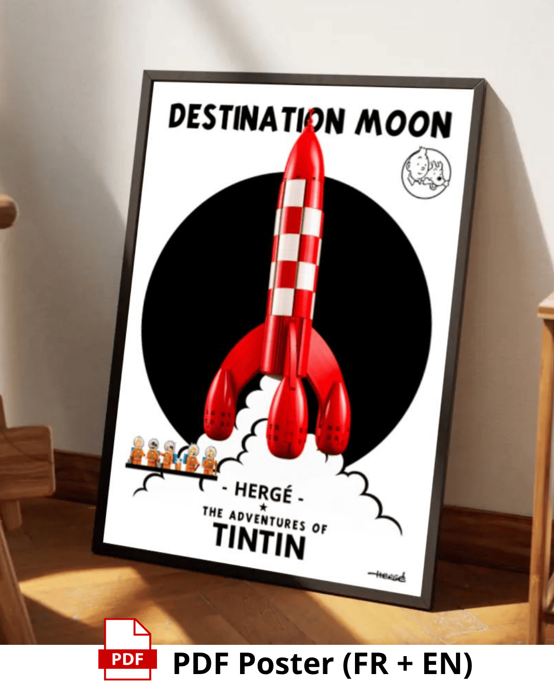🇫🇷 TINTIN – AFFICHE OBJECTIF LUNE – 50 × 70 CM (19,7 × 27,6 POUCES) – COMPATIBLE DISPLAY FUSÉE LEGO® – TÉLÉCHARGEMENT DIGITAL (PDF)