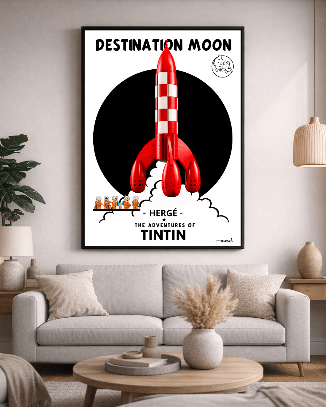 Digital poster compatible with LEGO® Tintin Rocket display, created to enhance your setup with a clean and elegant design inspired by Tintin – Destination Moon.