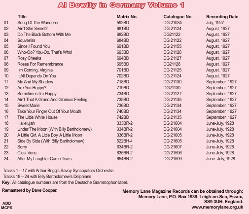 Here are Al Bowlly's first recordings as a vocalist, made in Germany in 1927 and 1928 in chronological order. These have like many of our releases have never appeared together in one set. Most of these sides have not actually been issued since their first showing back in the 1920s. The original 78rpms are very rare and attract high prices for collectors. Look out for a second volume soon.