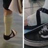 Without crutches and full weight bearing he walks to the waiting area. We sit next to him and can have a detailed look on his cast: well worn, quite dirty at some places near the toes... can you already smell his toes and his foot sole?