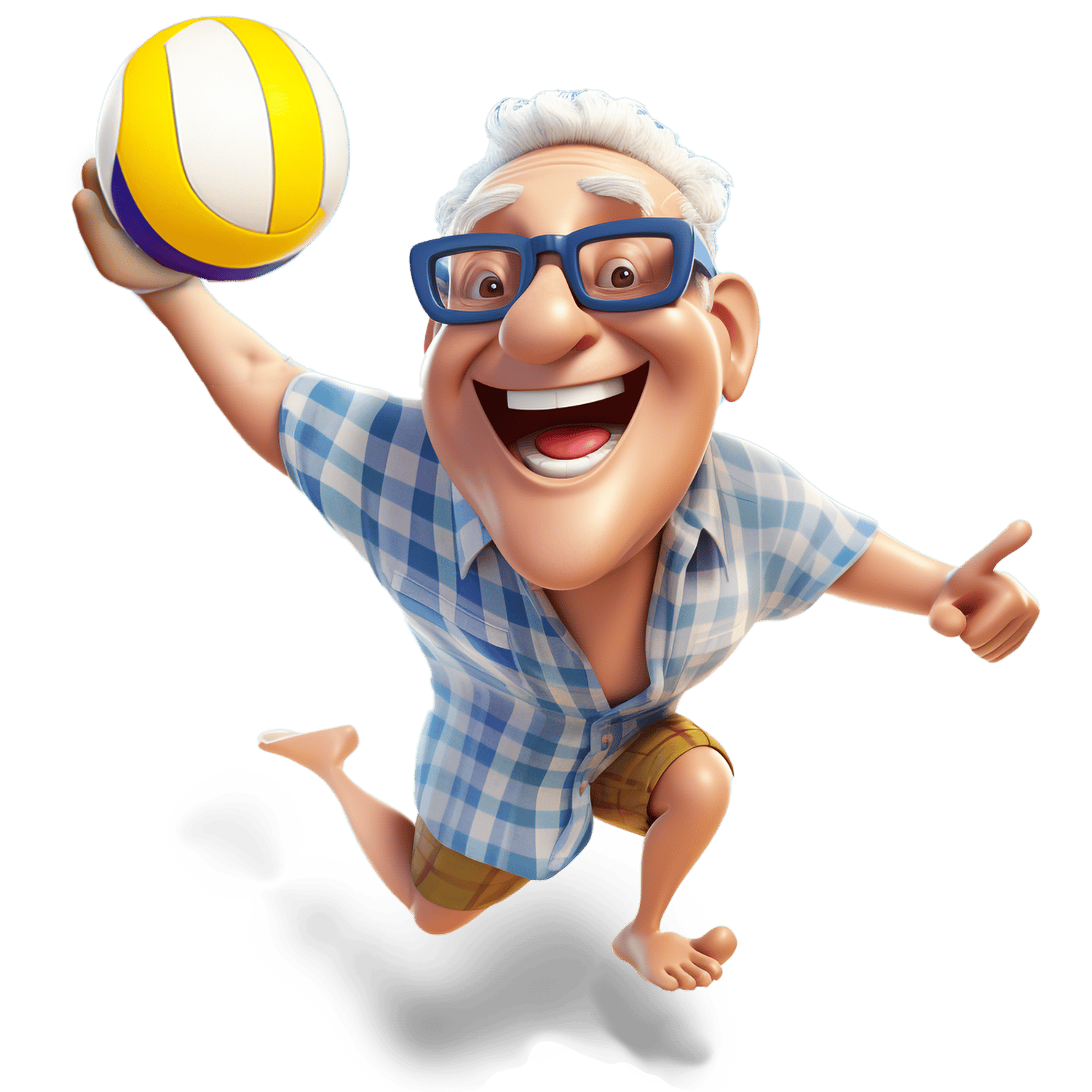 Depict active retirement with this illustration of a retired individual playing beach volleyball. The subject, attired in a loose-fitting shirt and shorts, and barefoot, is captured mid-serve with an exuberant smile. This representation encapsulates the essence of active senior living, underscoring the importance of joyous physical activity in later stages of life.