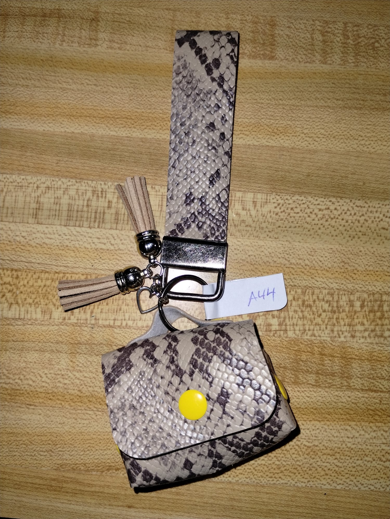 Item A44 Brown animal print air pod pro case and lanyard with brown tassles and a charm.
