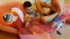 Kyllan and Nelson will show you how to burst all the balloons I have inflate for them inside a 3 meters long clear pink inflatable world orca.