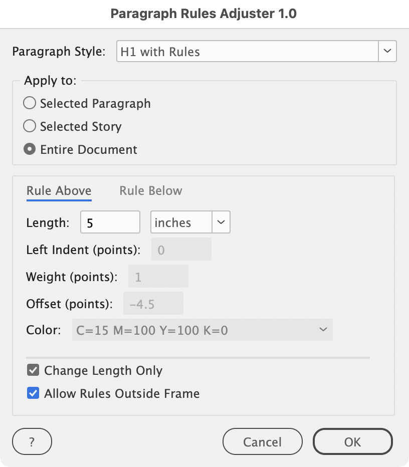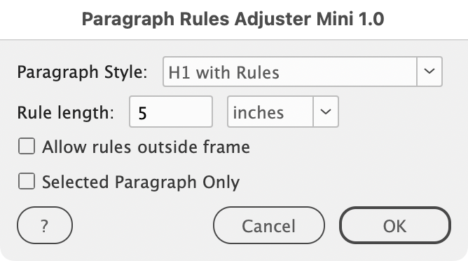 This Adobe InDesign script automatically adjusts the length of paragraph rules by calculating the required indents to achieve precise measurements. Users can specify exact rule lengths in various units (mm, cm, points, inches) and optionally modify essential properties like weight, color, and offset. The script works on selected paragraphs, stories, or entire documents.