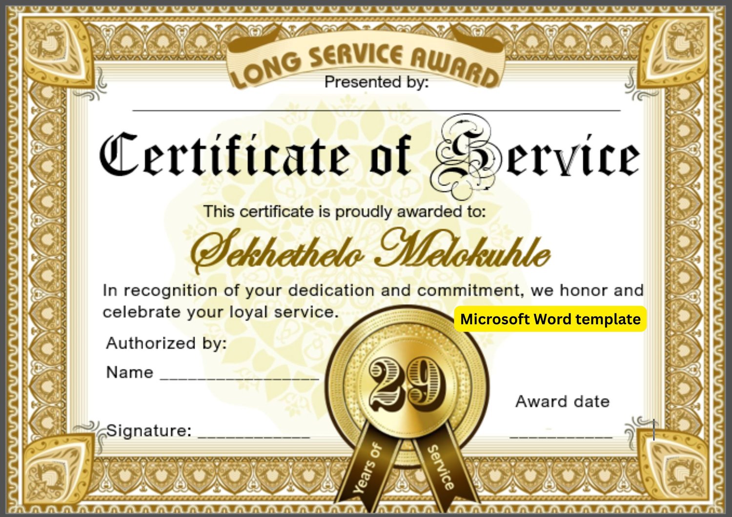 Mark a significant milestone in your employees' journey with our exclusive "29 Years of Service" digital certificate template for MS Word.