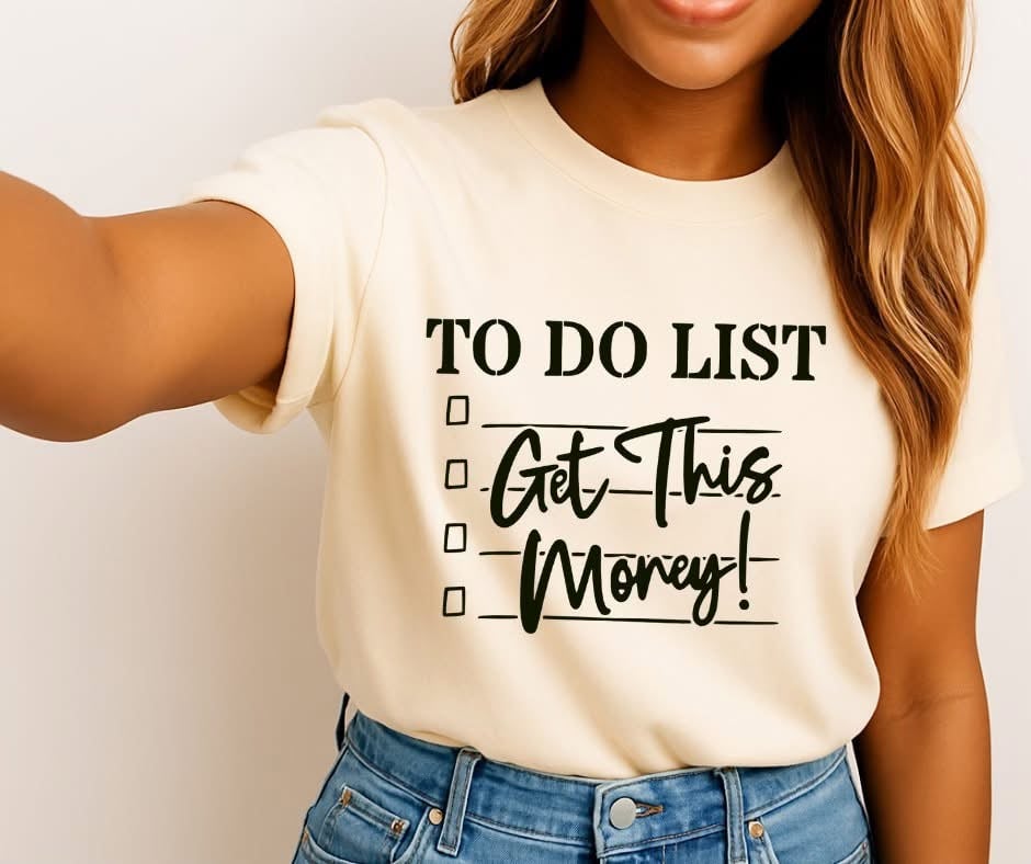Stay motivated and stylish with this bold “To Do List: Get This Money!” screen print design! Perfect for go-getters, hustlers, and boss babes who believe in chasing dreams and securing the bag. The mix of clean block letters and playful script makes it a standout piece for tees, hoodies, or sweatshirts.