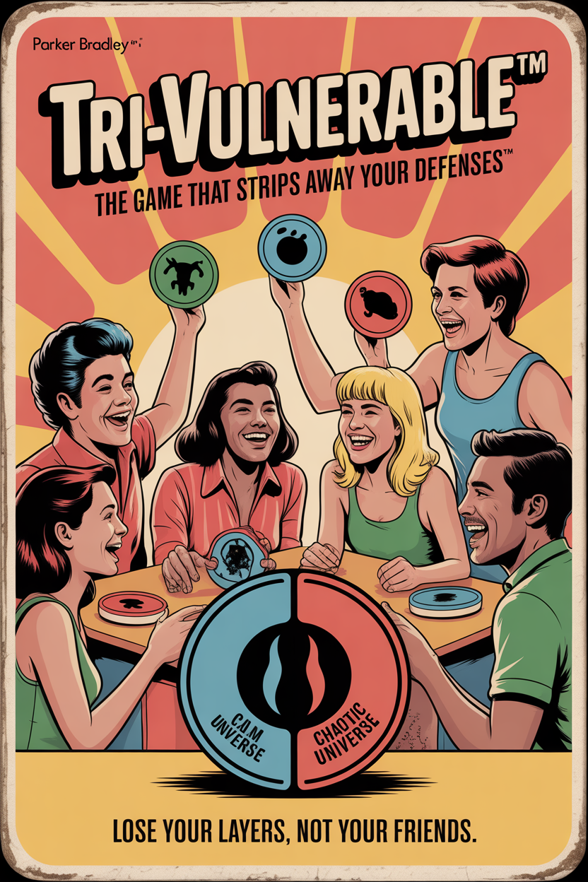 TRI-VULNERABLE™ is a fast, viral-ready party ritual that is both TRI-vulnerable (Body · Mind · Heart) and TRY vulnerable (the dare), where players risk "losing layers" of ego or clothing. Built with chaos triggers, Double Down rituals, and Evolution Slams, this cultural dare engine makes vulnerability safe, funny, and contagious theater. The timely social game blends truth-telling, ritual chaos, and consent culture in a structured interactive format. This IP scales across mixed groups, streaming moments, and expansion SKUs, with clear potential for both PG-13 play and adult strip expansions.