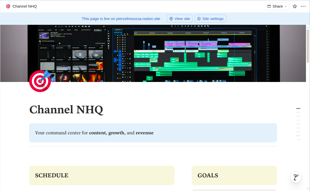 🎯 Channel NHQ — Your command center. See your publish schedule, active productions, and monthly goals the moment you open Notion.