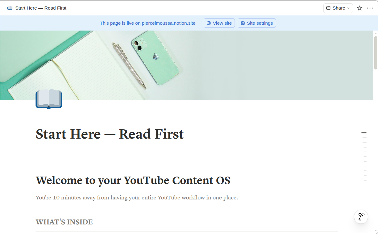 The YouTube Content OS is a complete Notion template built specifically for YouTubers — whether you have 100 subscribers or 100,000.