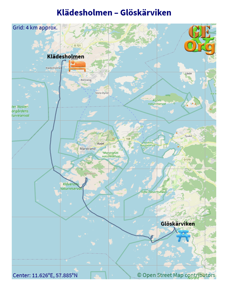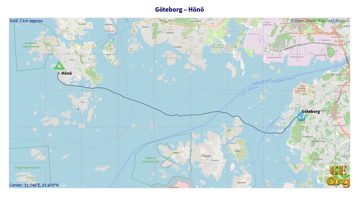 Paddling tour Göteborg to Hönö, Sweden, one GPX file, one GeoJSON file, one OpenStreetMap.