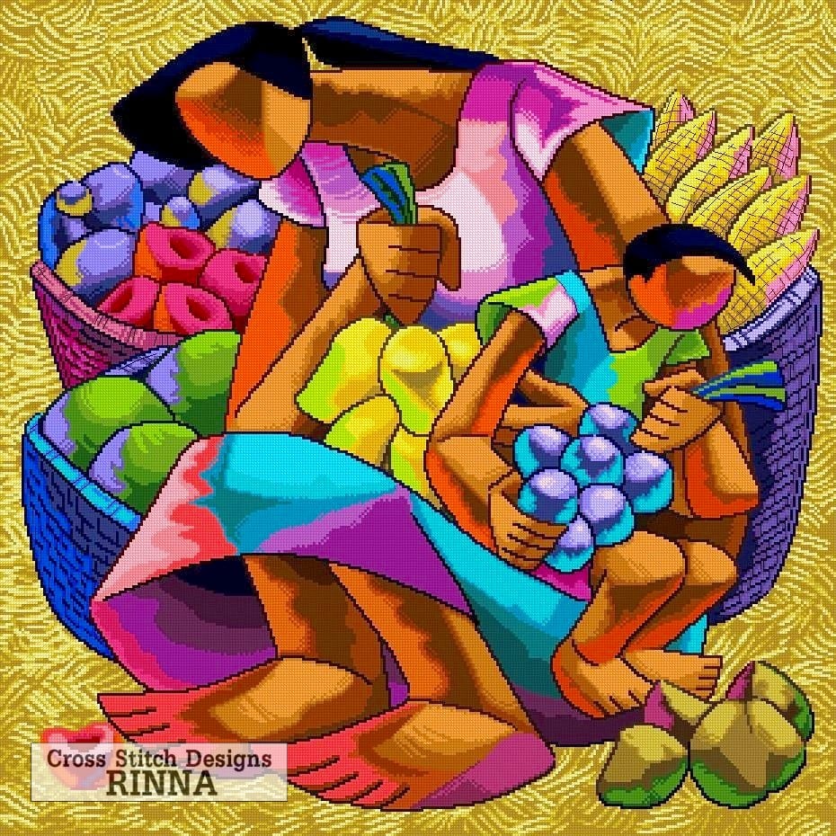 Filipino Art Mother and Child Fruit Vendors Design in Cross Stitch PDF Downloadable Digital Print