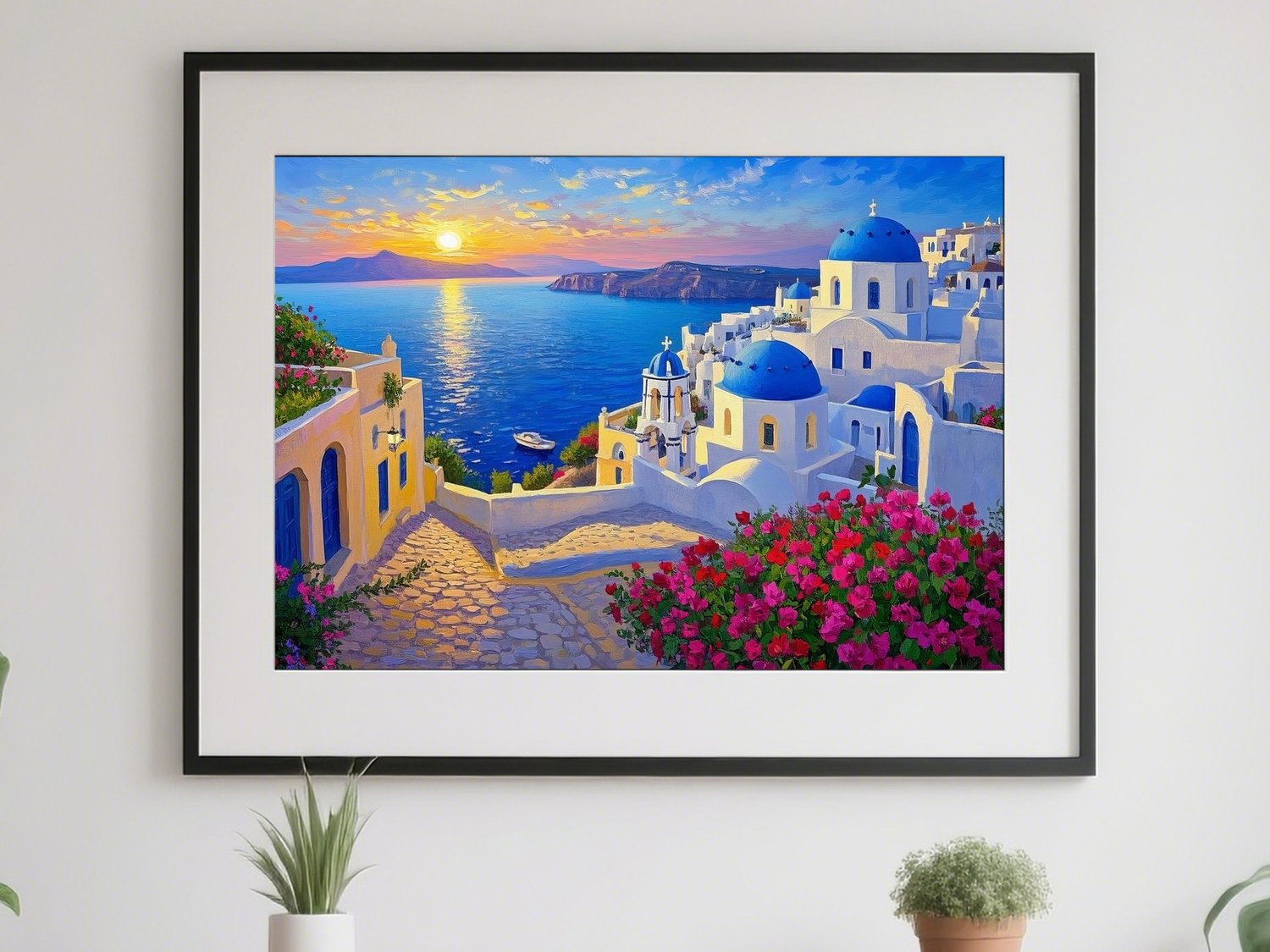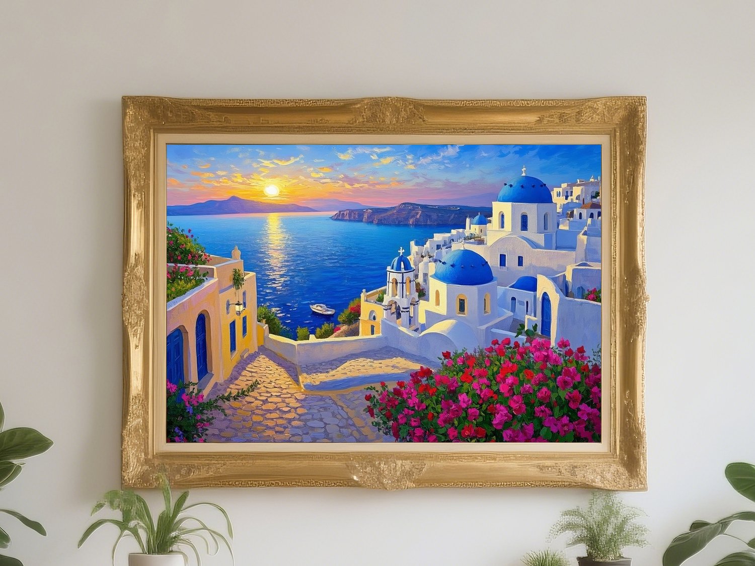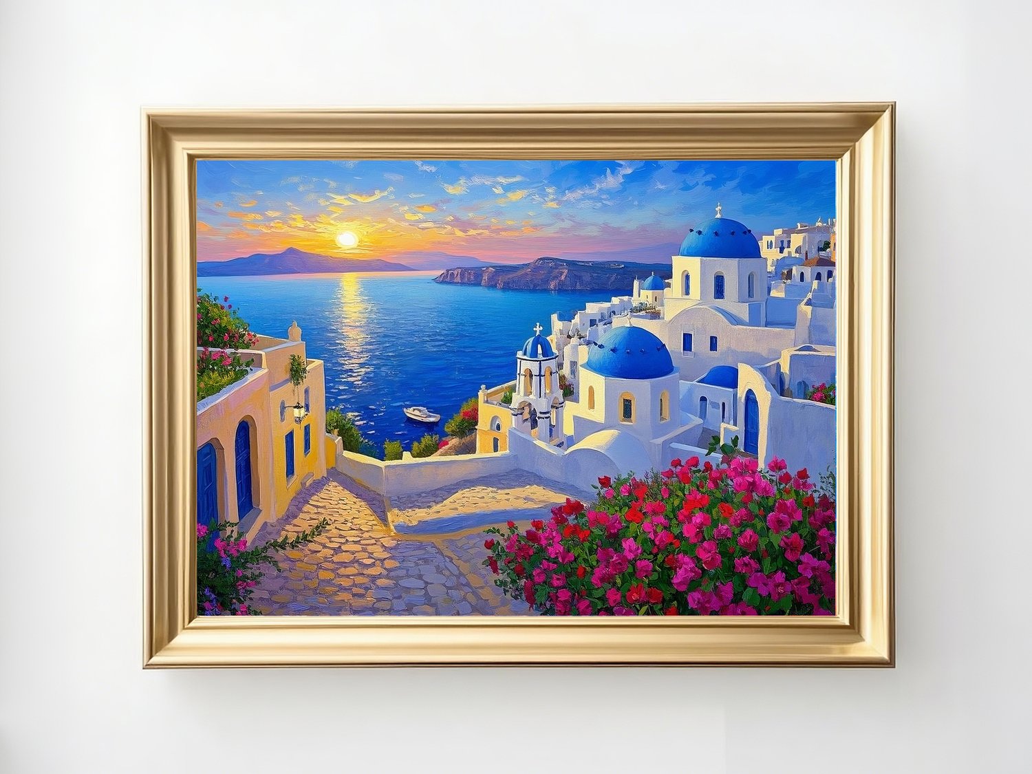 A mesmerizing digital painting of Santorini at sunset, featuring glowing seas, vibrant flowers, and the iconic blue domes. This Feng Shui artwork promotes abundance, emotional healing, and romantic harmony. Perfect for bedrooms, living rooms, or spaces where you wish to invite love, gratitude, and serene beauty.