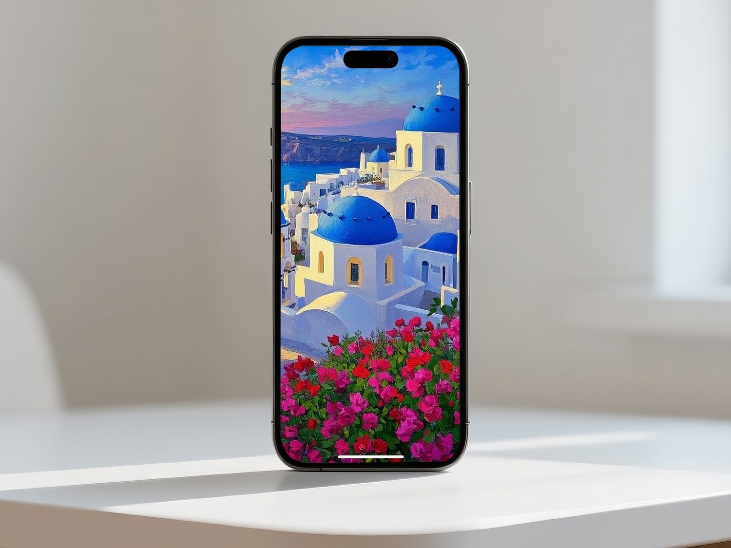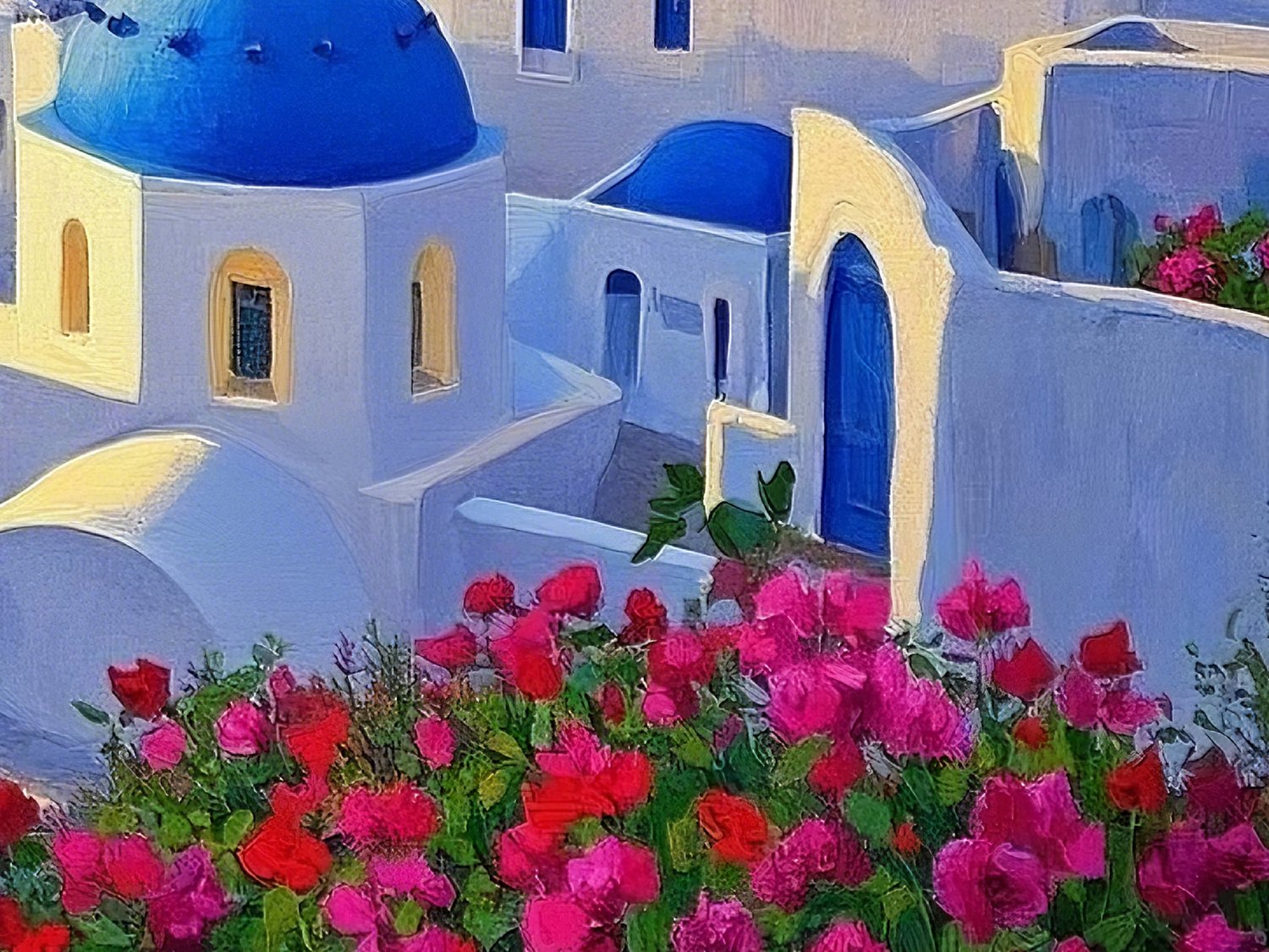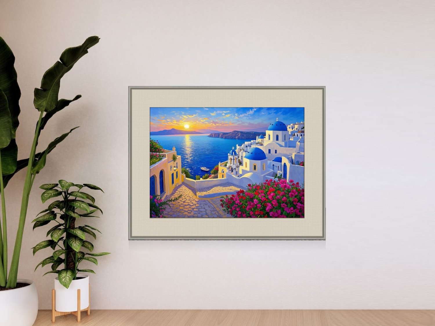 A mesmerizing digital painting of Santorini at sunset, featuring glowing seas, vibrant flowers, and the iconic blue domes. This Feng Shui artwork promotes abundance, emotional healing, and romantic harmony. Perfect for bedrooms, living rooms, or spaces where you wish to invite love, gratitude, and serene beauty.
