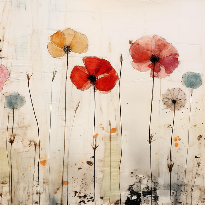 This artwork layers delicate outlines, pastel blossoms, and bright red petals across a parchment backdrop, with playful paint splashes and textures grounding the piece. Both whimsical and refined, Field Notes feels like an artist’s sketch come to life — a floral study that brings quiet creativity into your space.