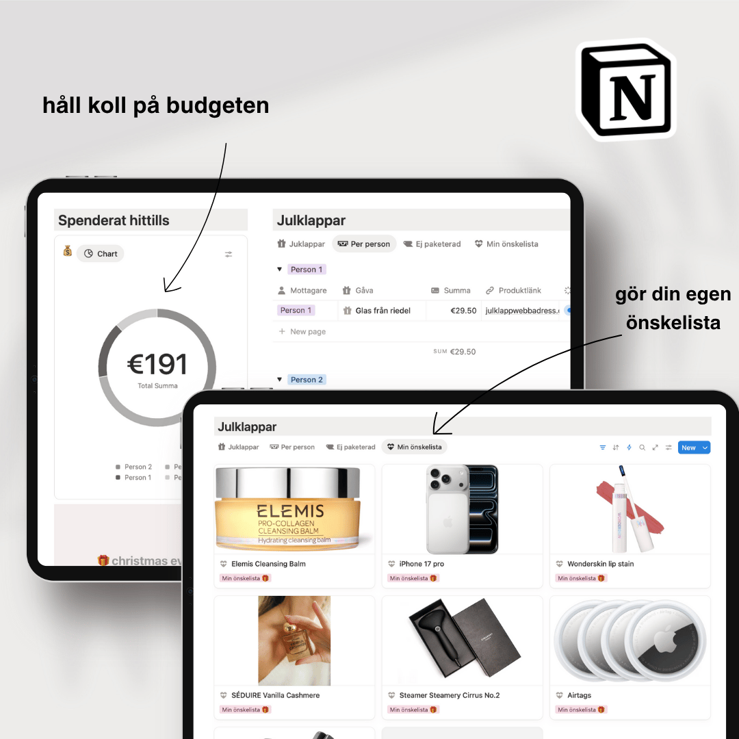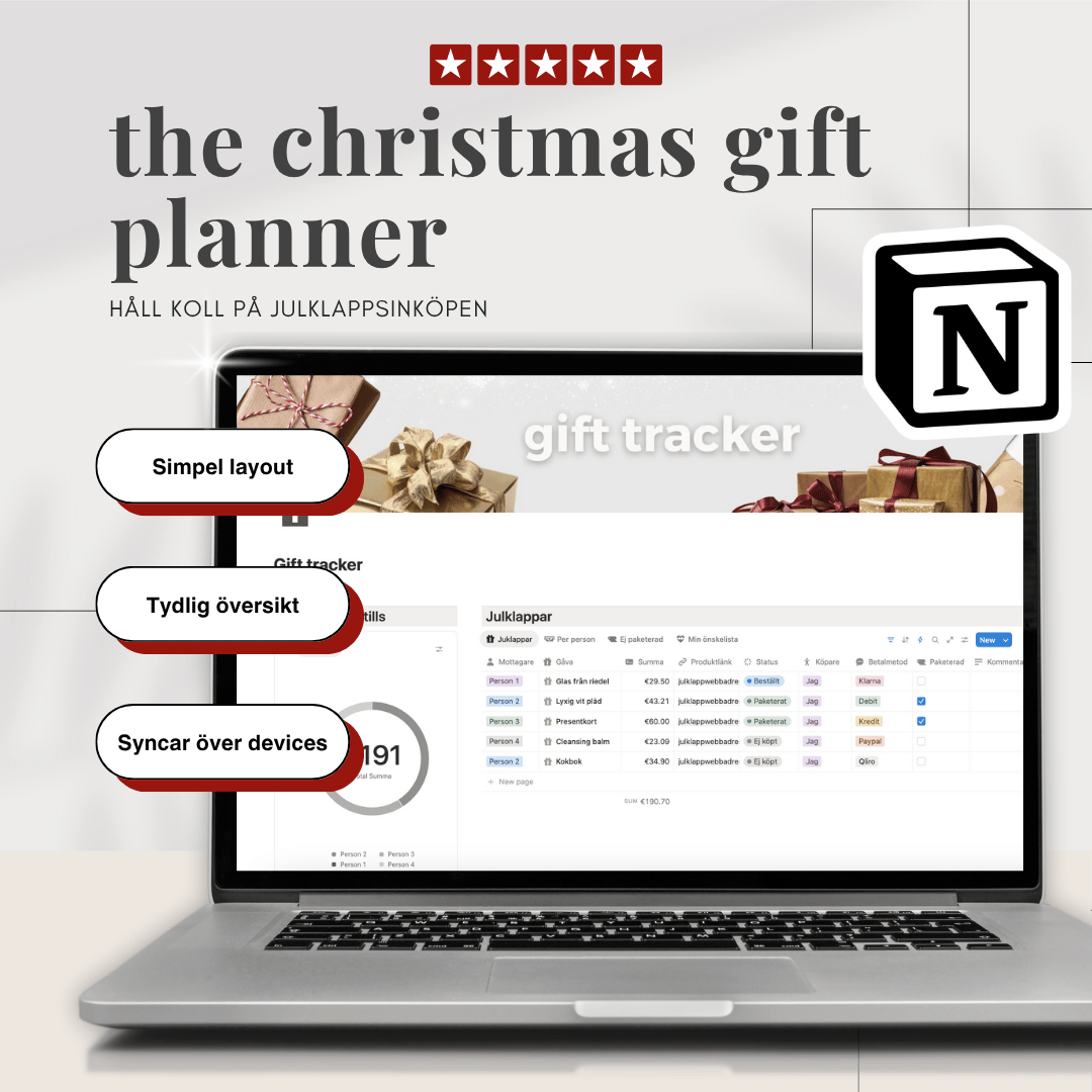 Allt samlat i ett snyggt och enkelt Notion-template som gör planeringen både roligare och mer strukturerad.