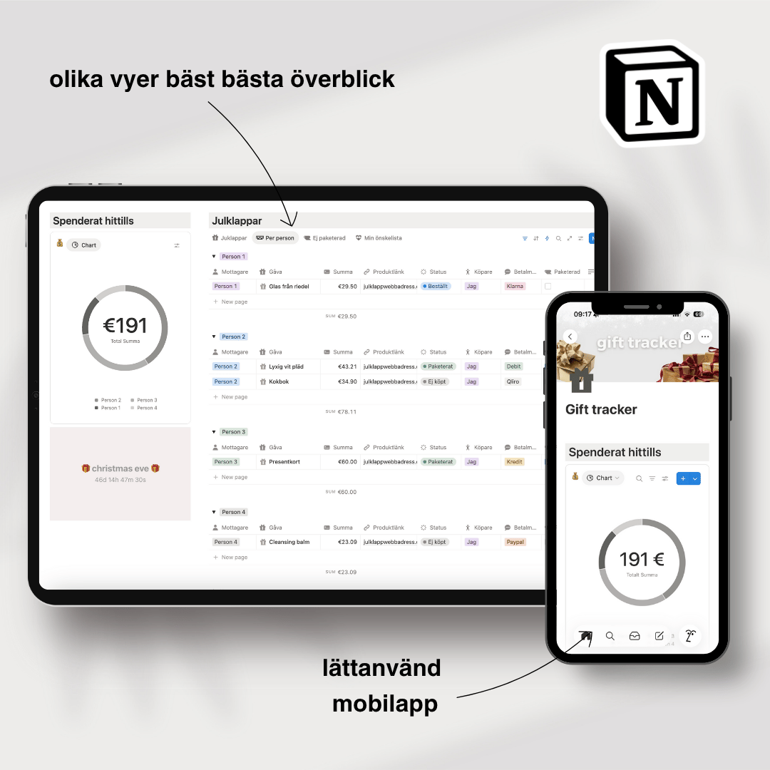 ✔️ Hjälper dig hålla koll på både pengar och presenter