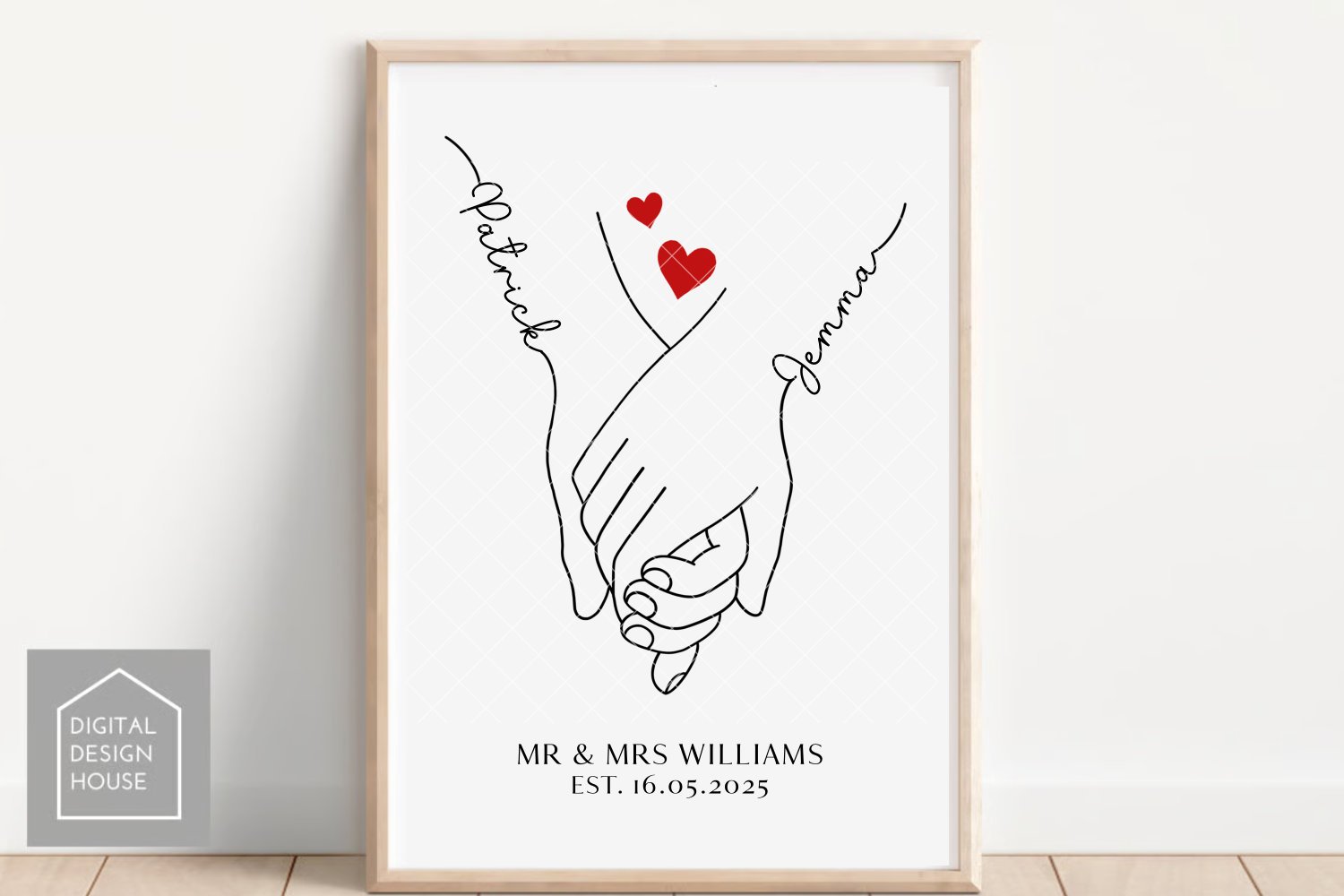 Celebrate love in a beautifully simple way with this elegant hand-in-hand line drawing. Add your own names to create the perfect personaliesd illustration β ideal for prints, cards, cushions, ornaments, wedding stationery, and more!