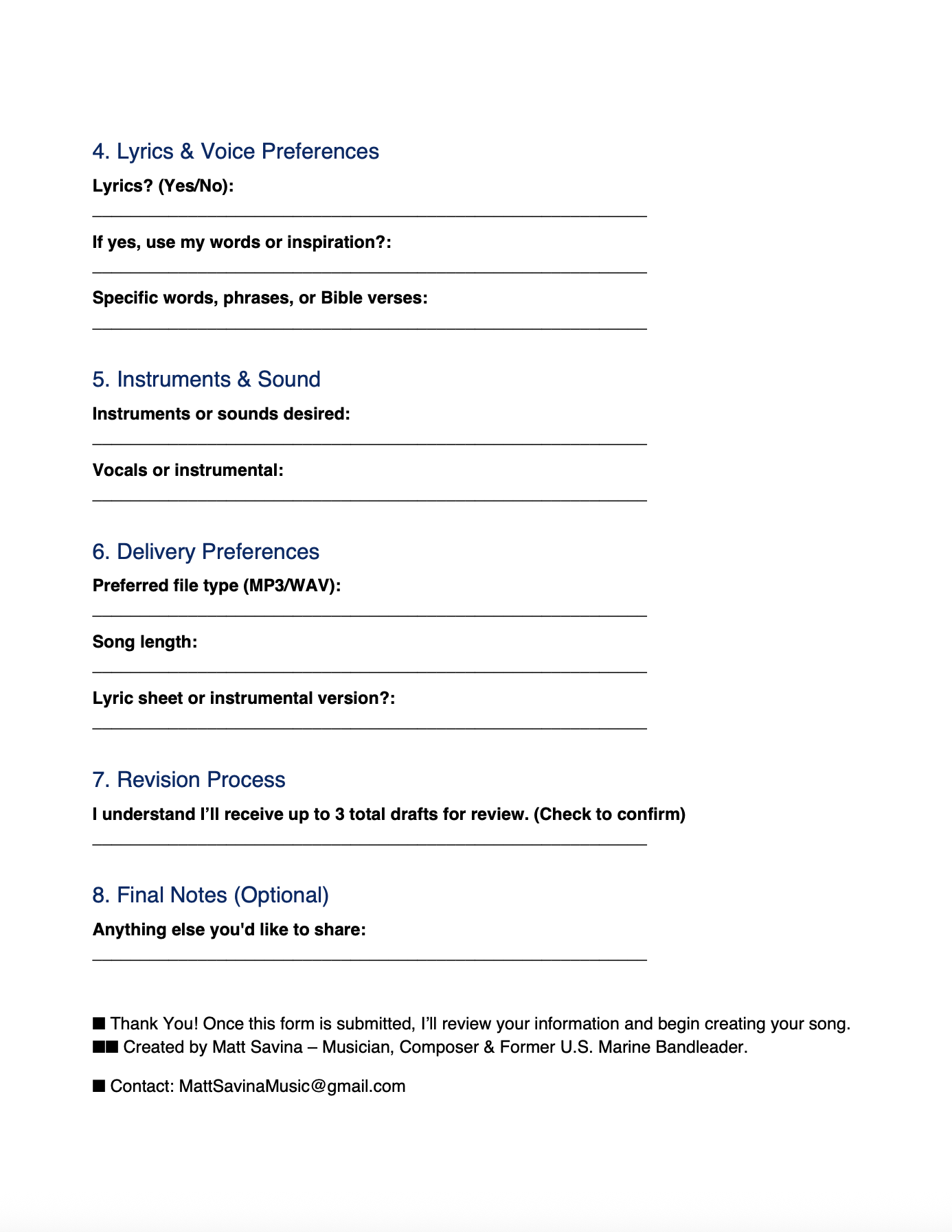 You can explore hundreds of original song demos to hear the quality and style youβll receive on YouTube @MattSavina or @MattSavinaMusic