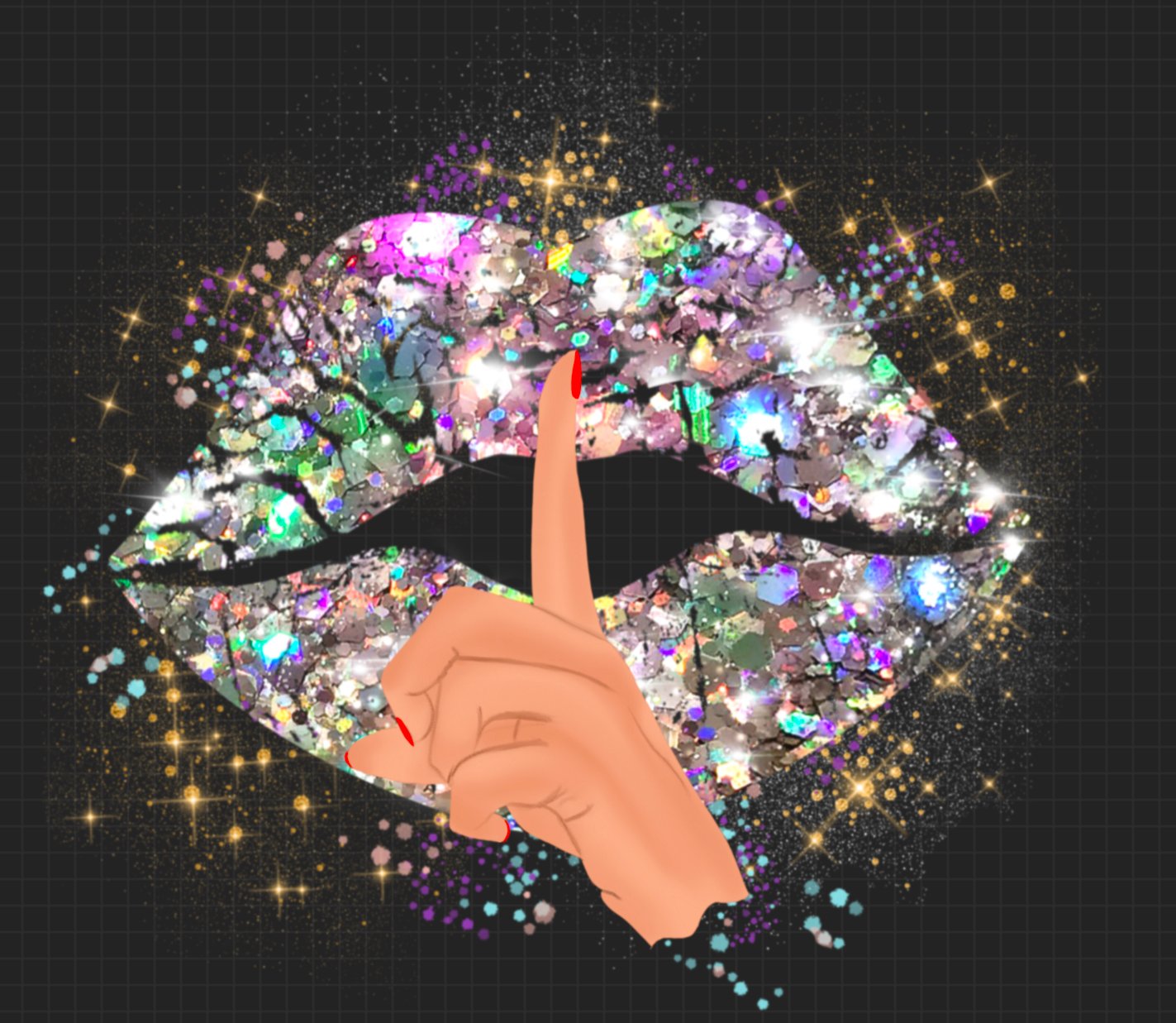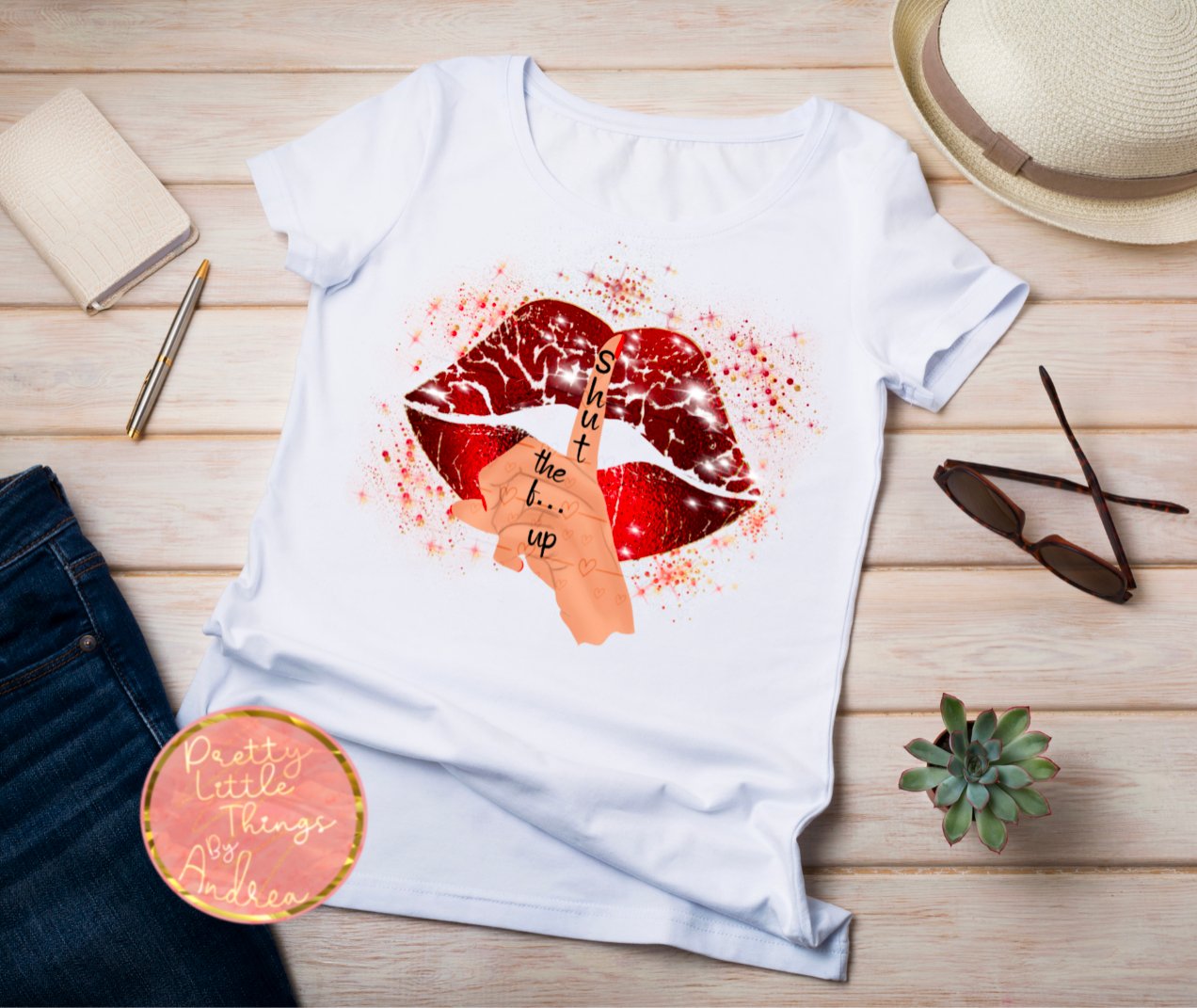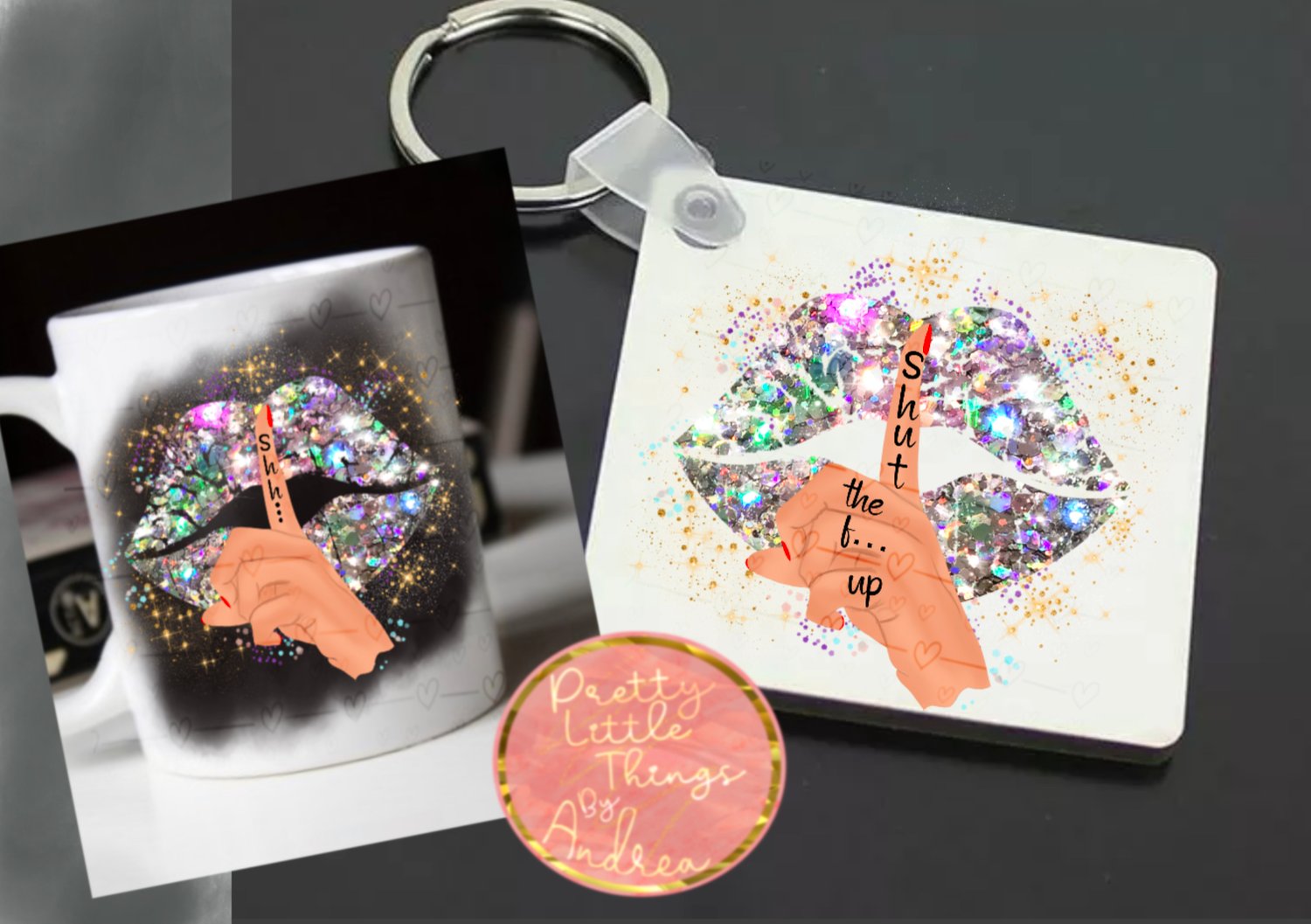 Glitter lips with 3 colour options, each with a choice of either "shhh..." or "shut the f... up", or blank with no text.