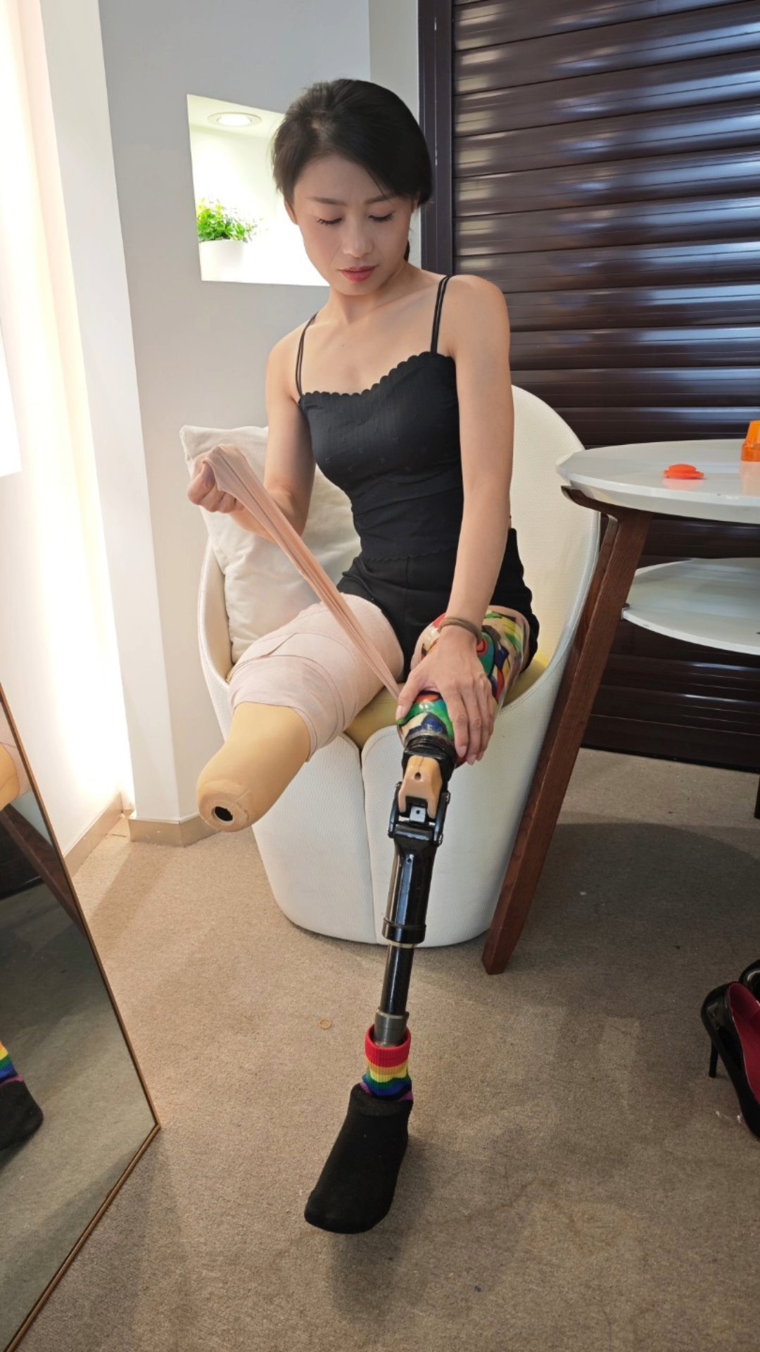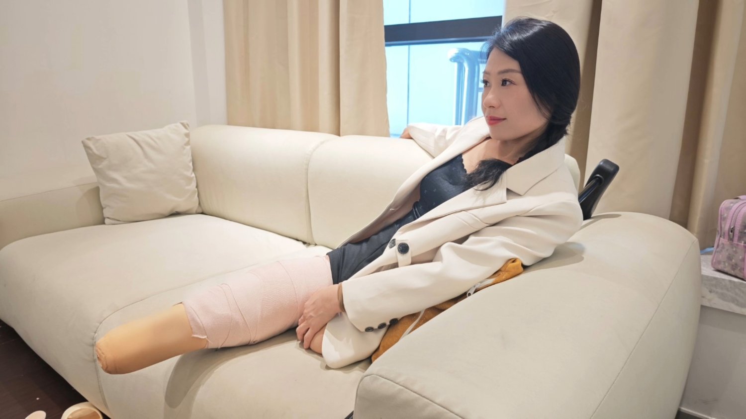 Ayla tried something very unusual today: she wrapped her good leg in bandages as well, hiding her lower leg, making it look like both of her legs had been amputated. She tried to move to the sofa like this, but it didn't seem to be very easy. This made her feel very curious.