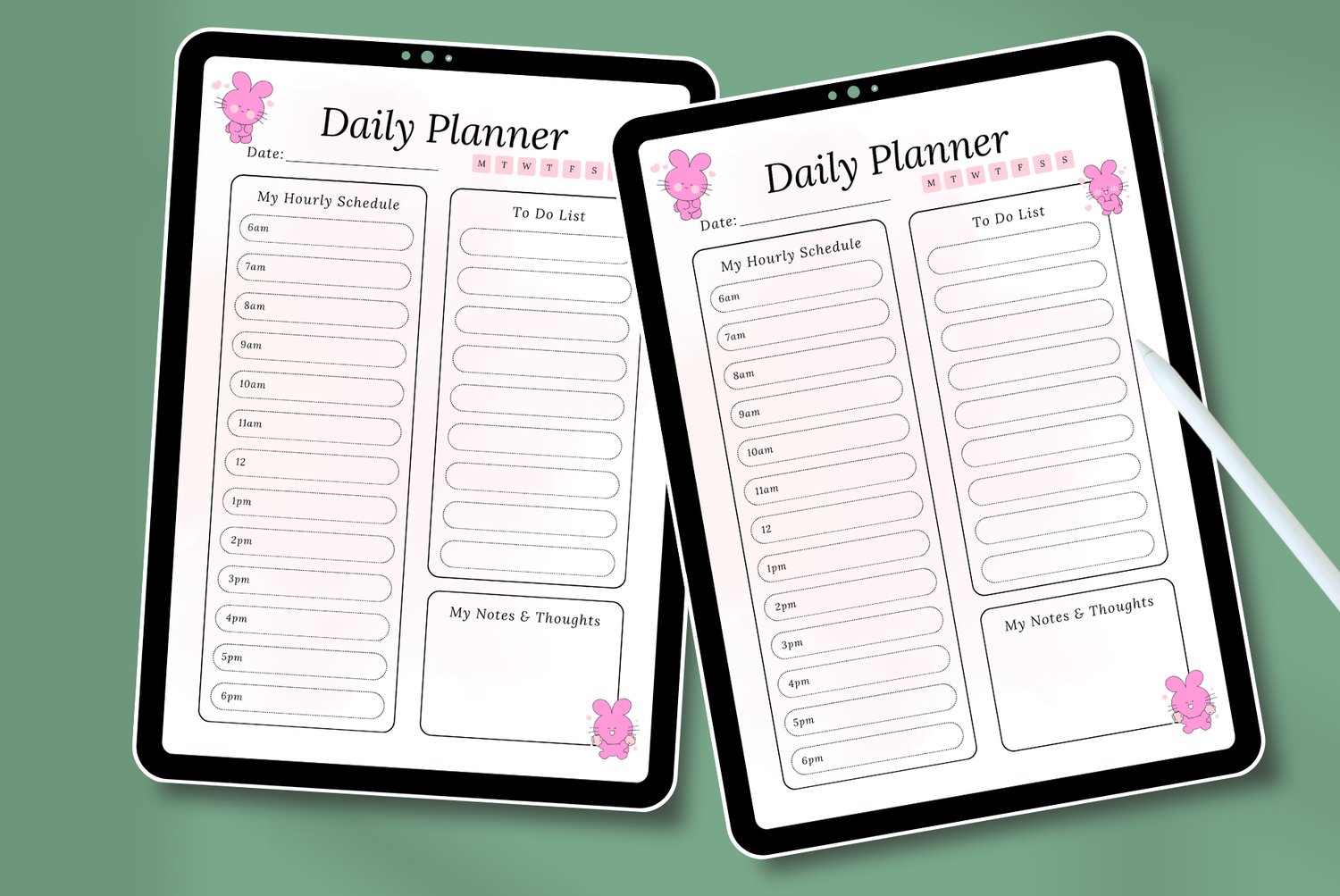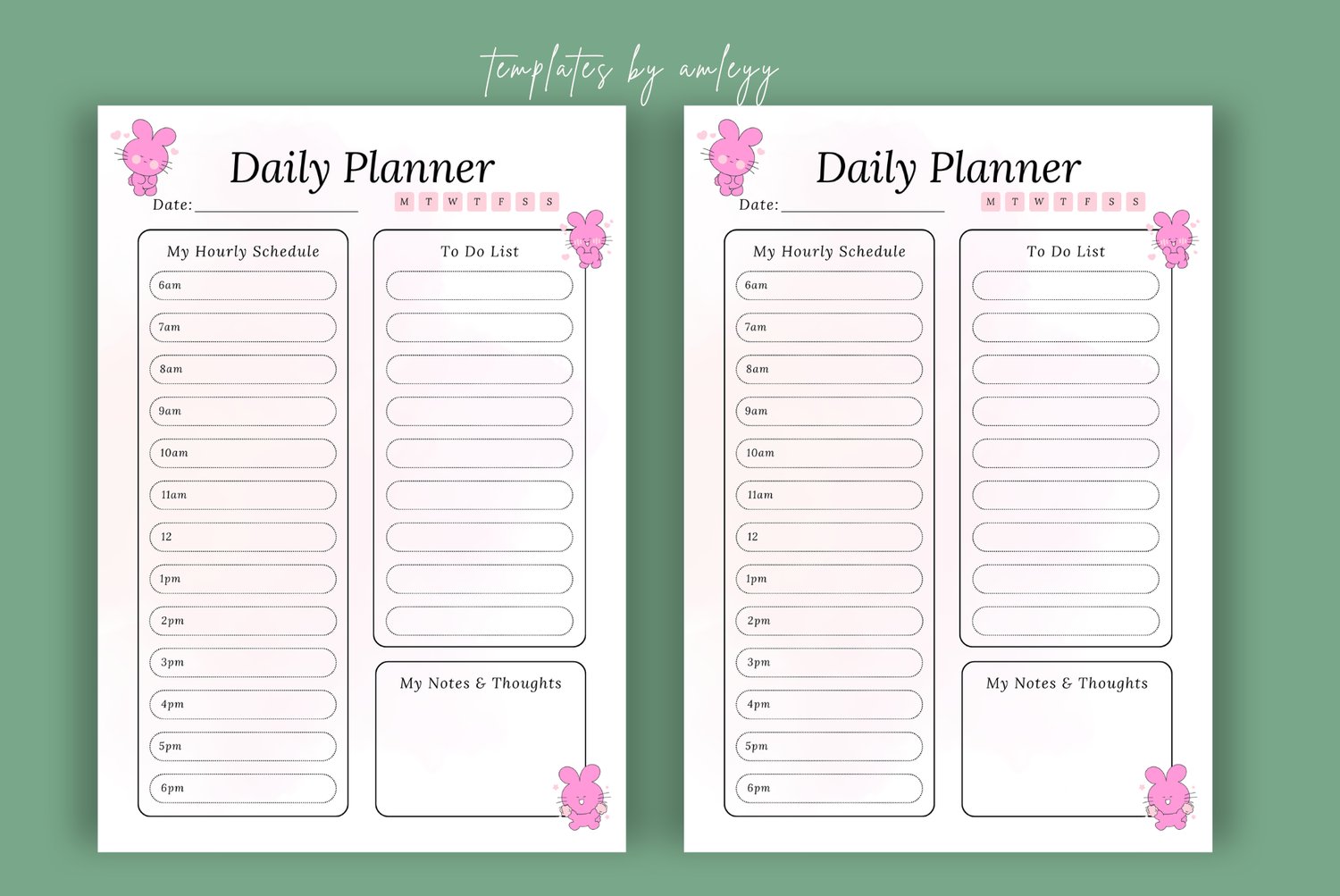 Kawaii Daily Planner Template (Canva) - Cute Pink Bunny Hourly Schedule & To Do List Printable