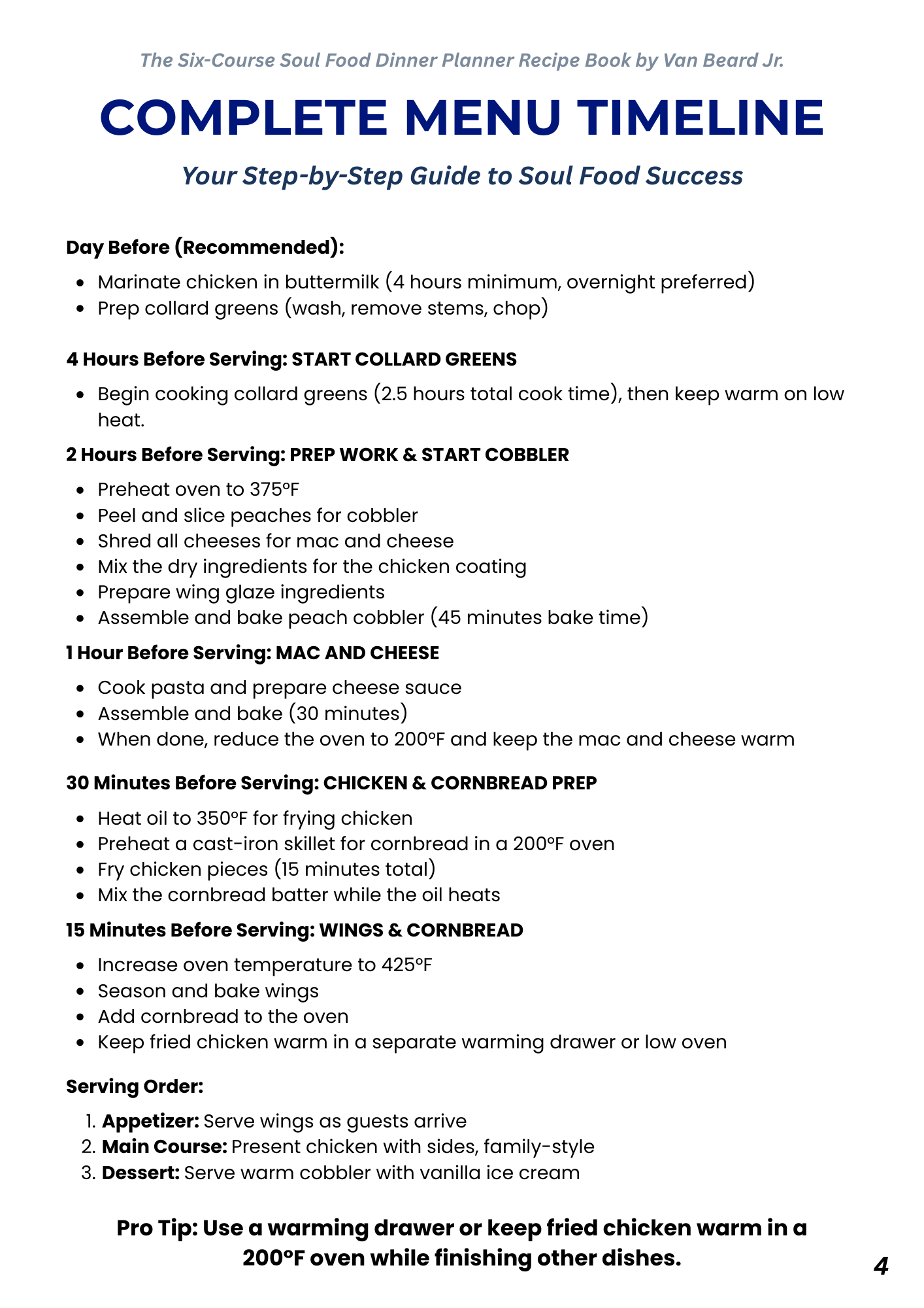 THE PROBLEM: Traditional cookbooks give you recipes, leaving you scrambling to coordinate everything. How do you get buttermilk fried chicken, mac and cheese, collard greens, cornbread, wings, AND peach cobbler on the table simultaneously—all perfectly hot?