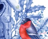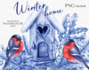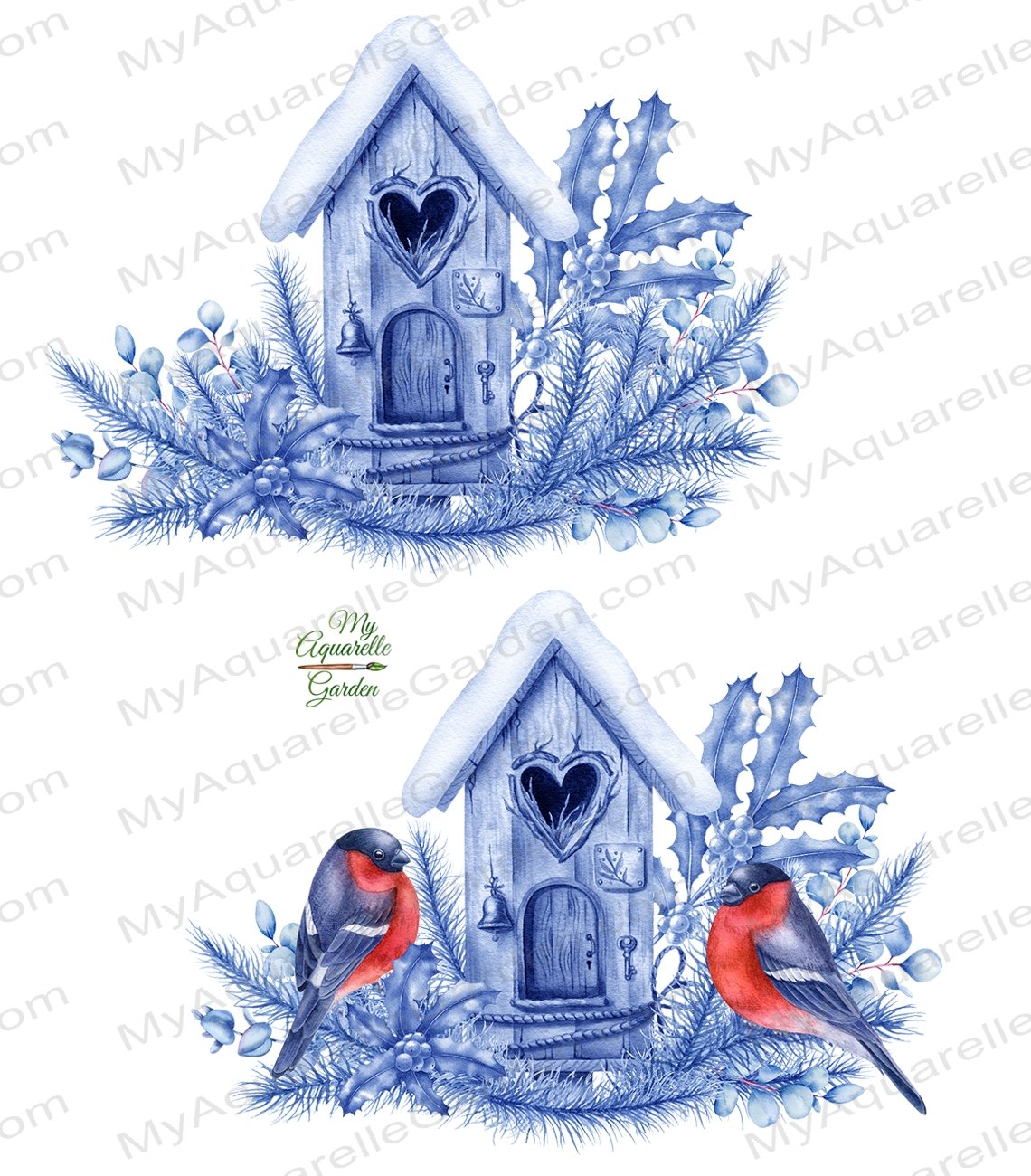 Winter birdhouses with bullfinches and silver wreaths. Christmas, Winter, New Year decoration.