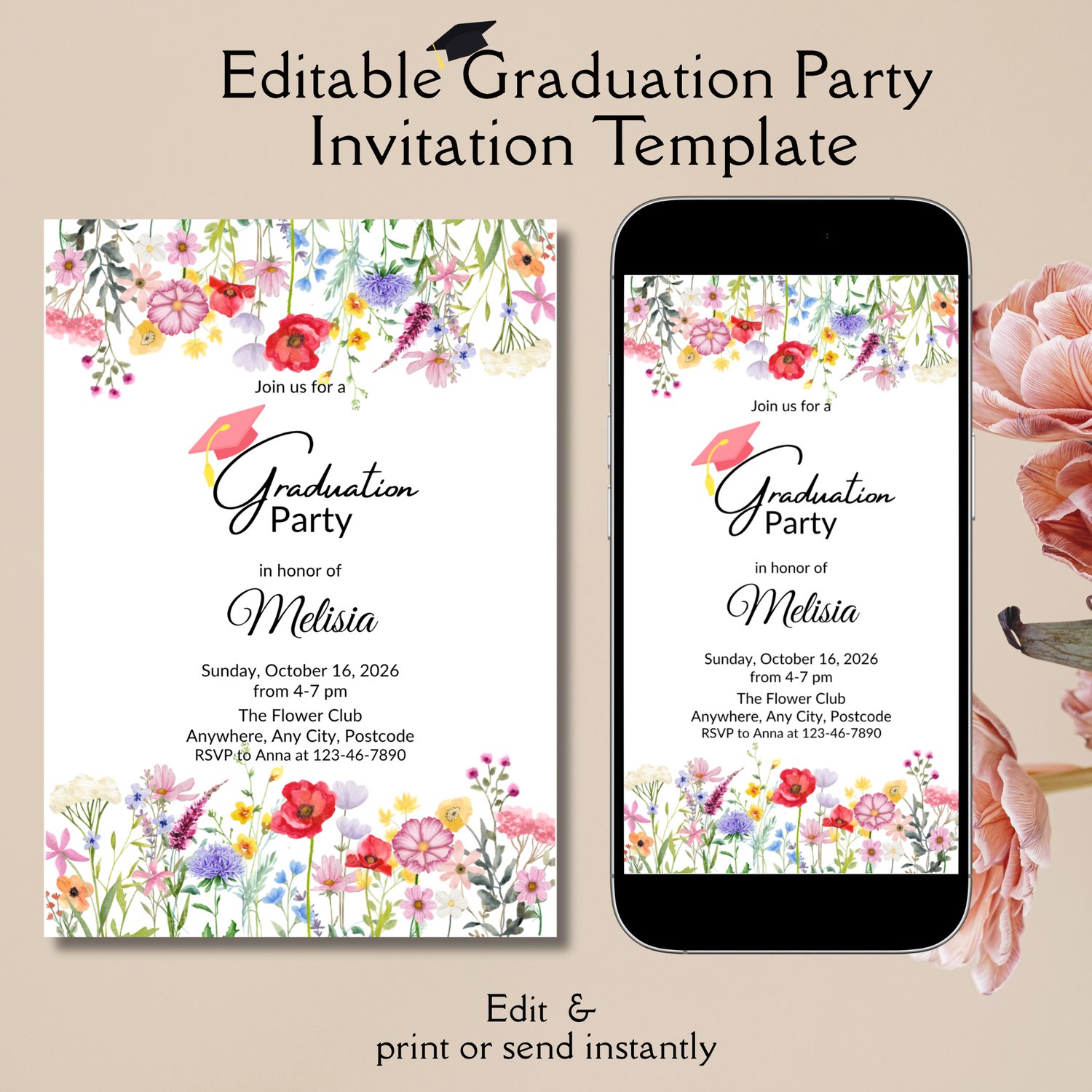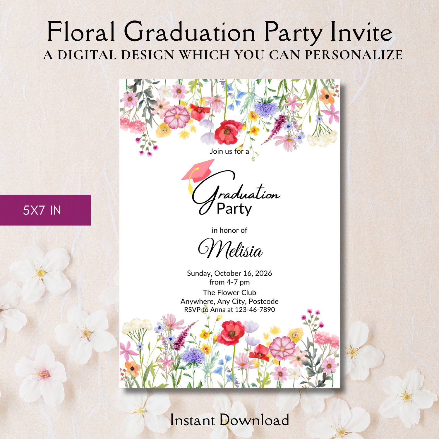 - Floral Graduation Invitation Template 5x7 in (good for printing)