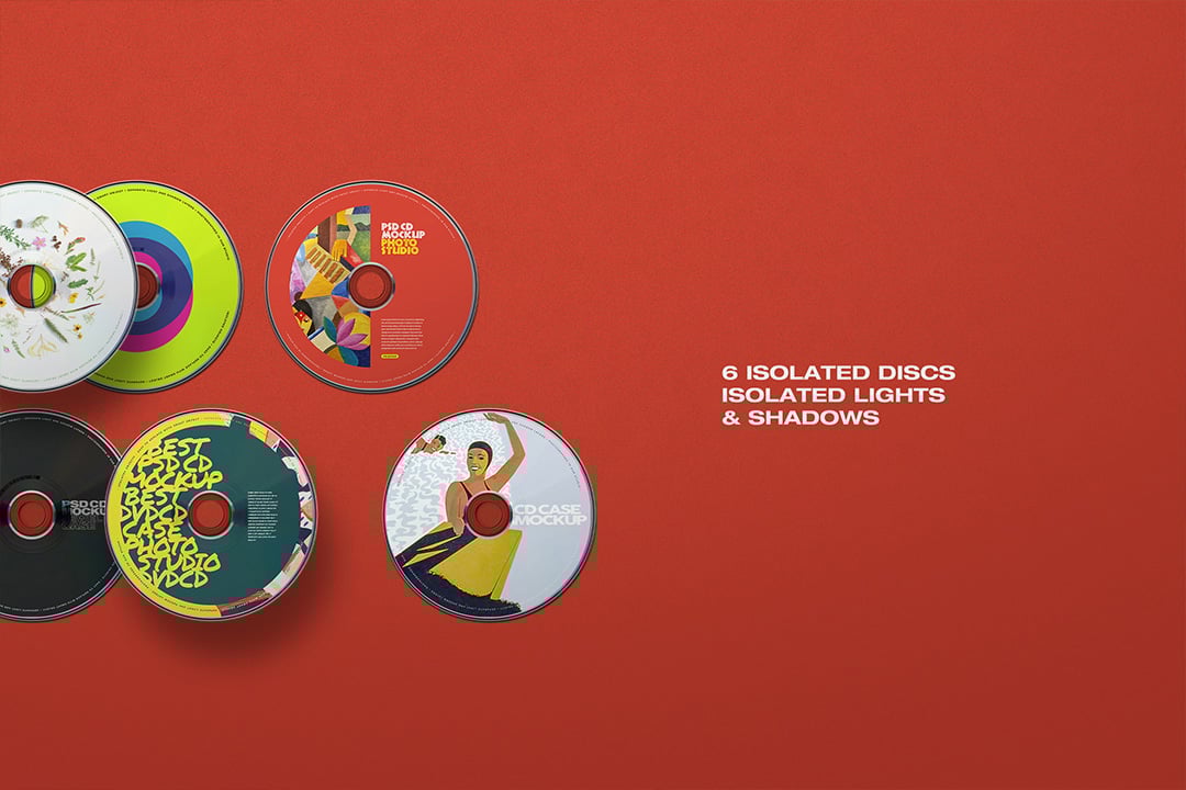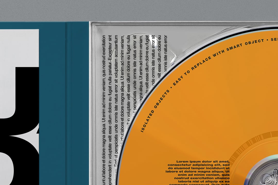 Flat-lay CD case mockup with cardboard packaging, booklet, disc, and 5 isolated objects, featuring Smart Objects and independent lights and shadows.