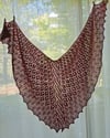 The shawl is knit from the top down with a center spine diamond panel and gradually changing diamond lace on the sides. It is designed as more than a triangle to sit snug upon the shoulders. Size is customizable - I designed the lace patterns so that any number of repeats of the individual motifs can be knit.