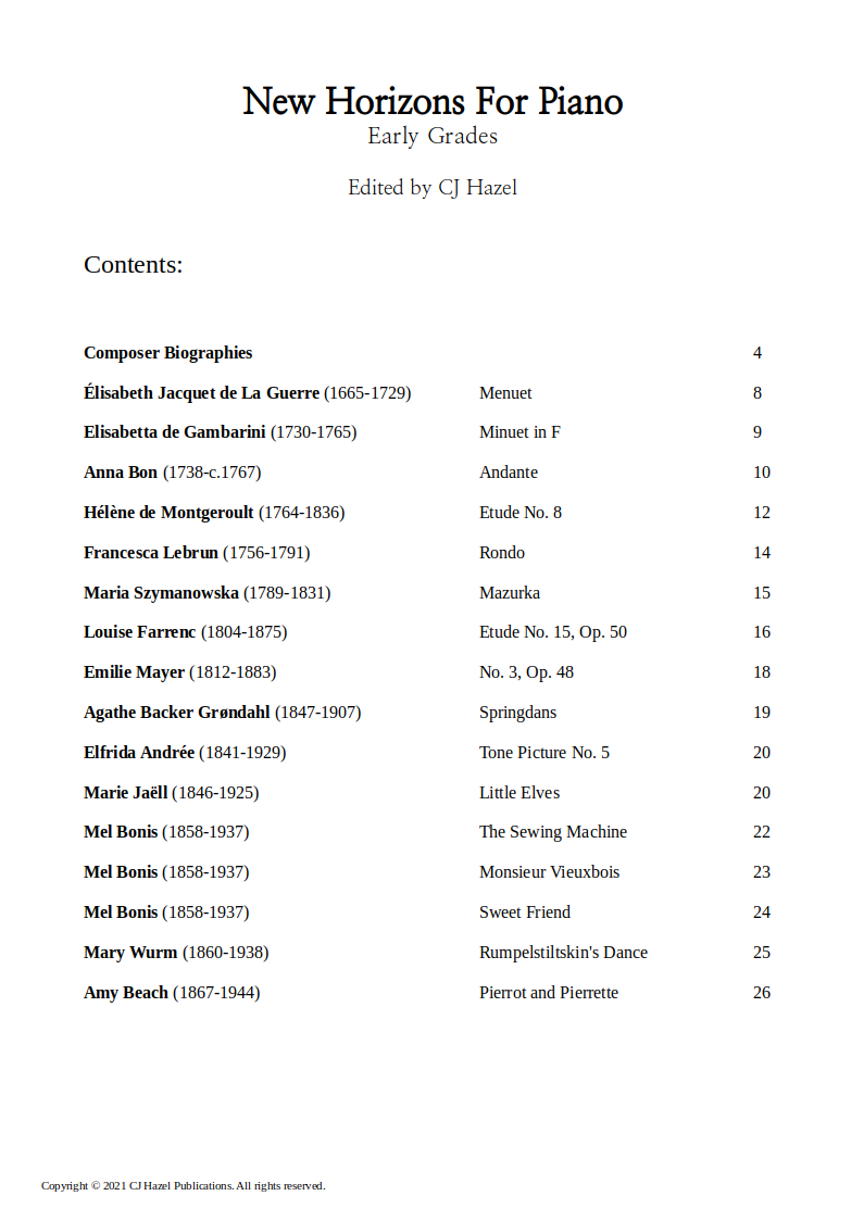 New Horizons for Piano: Early Grades is a collection of piano studies by historical woman composers. In addition to being highly acclaimed composers and performers, some of these artists contributed huge resources to the art of piano teaching, resources whose historical significance and practical utility are only now being realised. This collection brings together sixteen pieces from the late 17th to the early 20th century which have been carefully selected to cover a wide range of piano styles and their various musical and technical challenges. The perfect addition to any course of piano study.