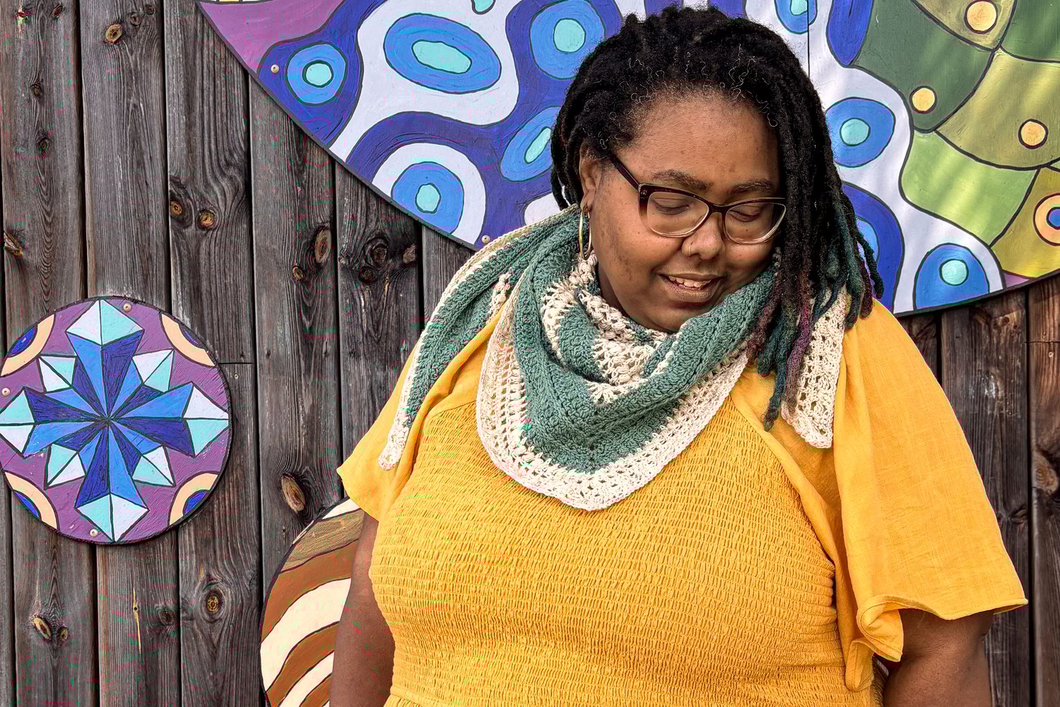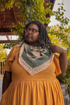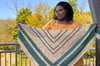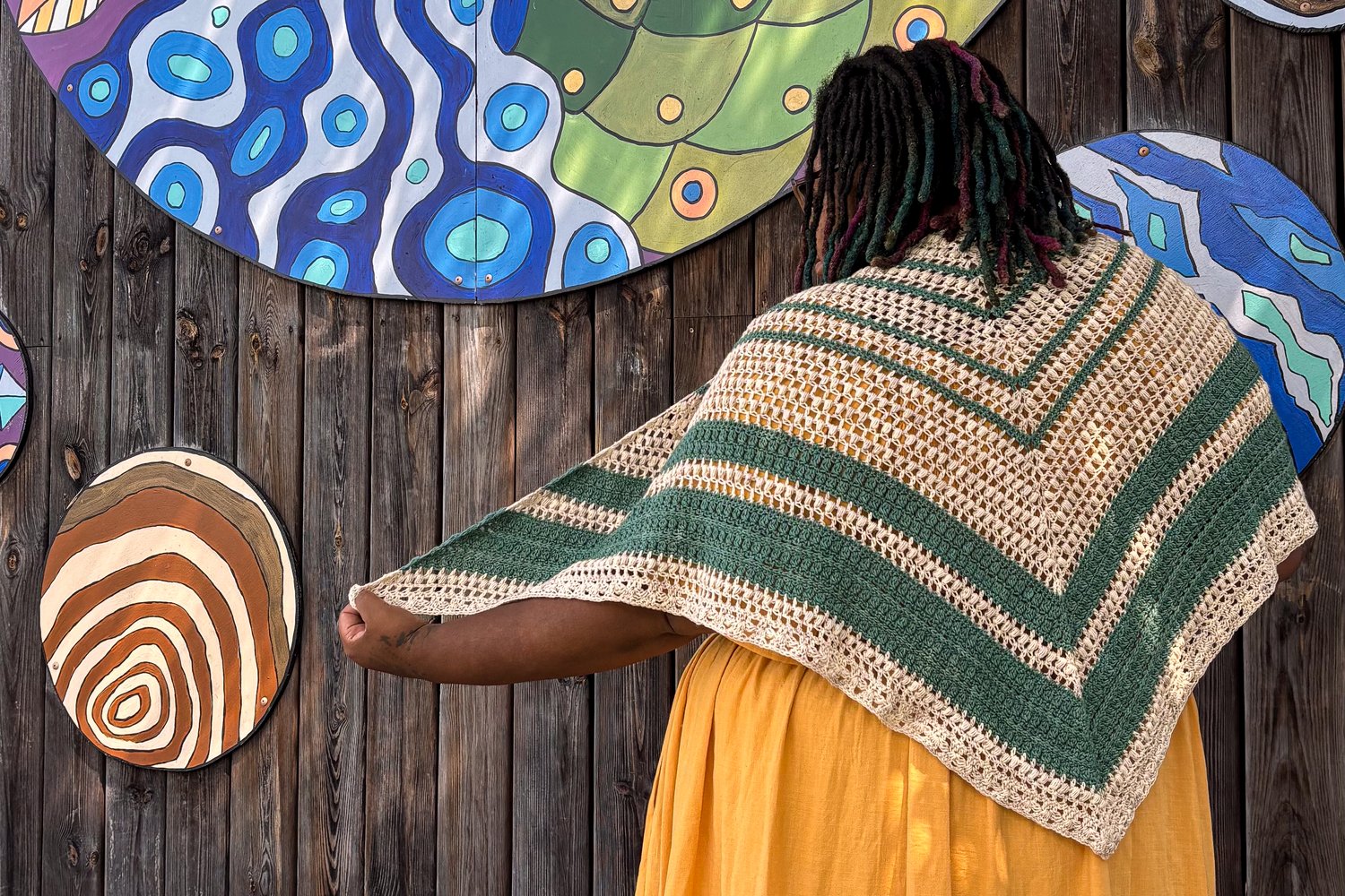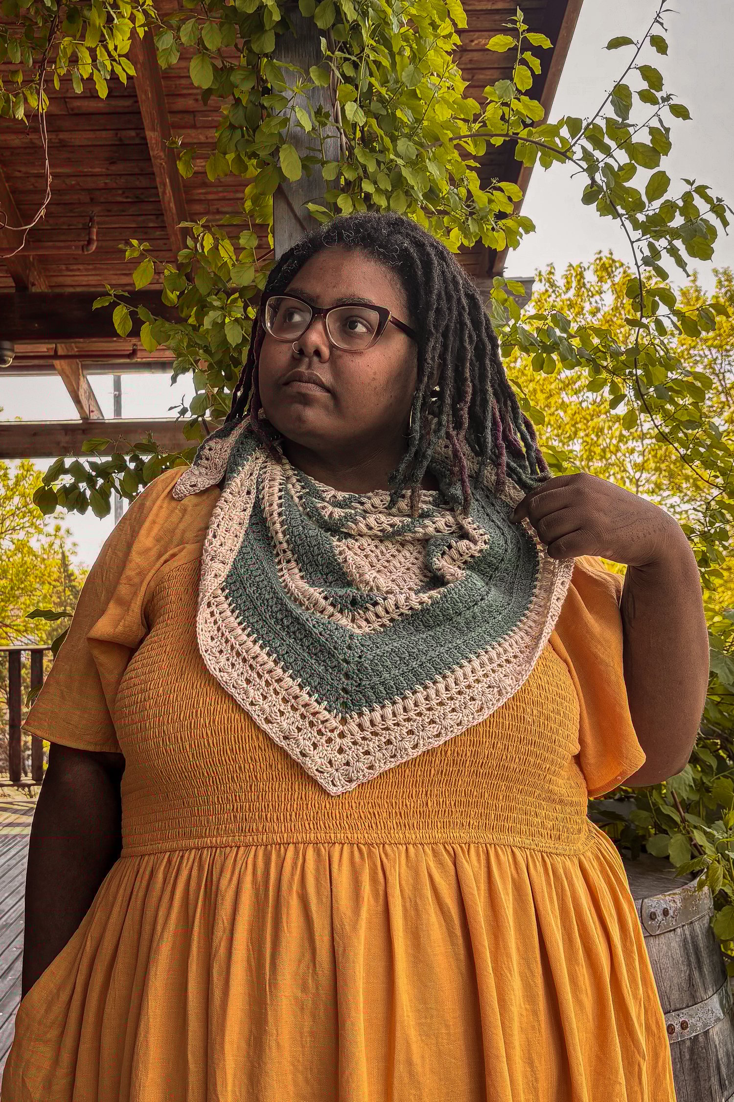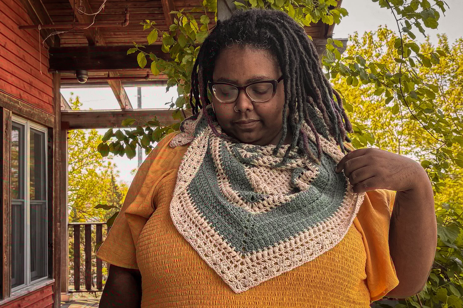 This crochet shawl is a top down, meditative project, my gift to an overstimultated brain. It works best in a cotton or cotton blend for a lightweight shawl to throw over a dress for a bonfire on a cool summer night; but you can also make it from a heavier wool to make something to keep you warm all through the winter.
