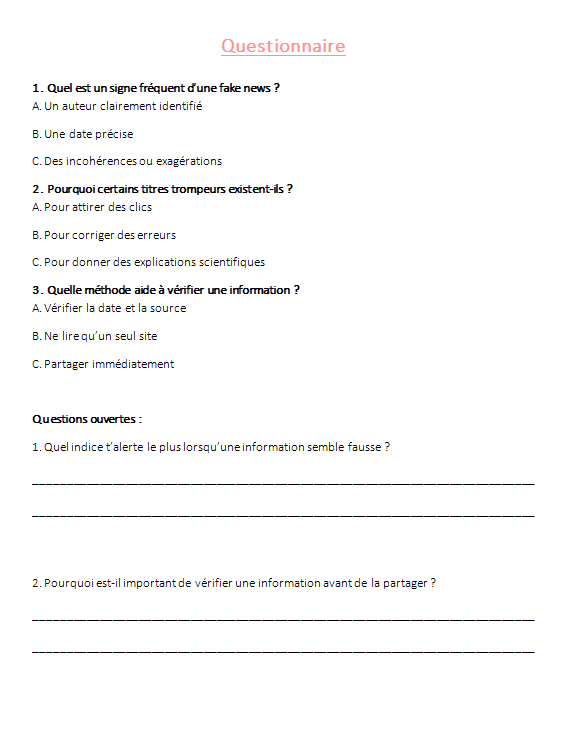 - Un questionnaire élÚve (QCM + questions ouvertes)