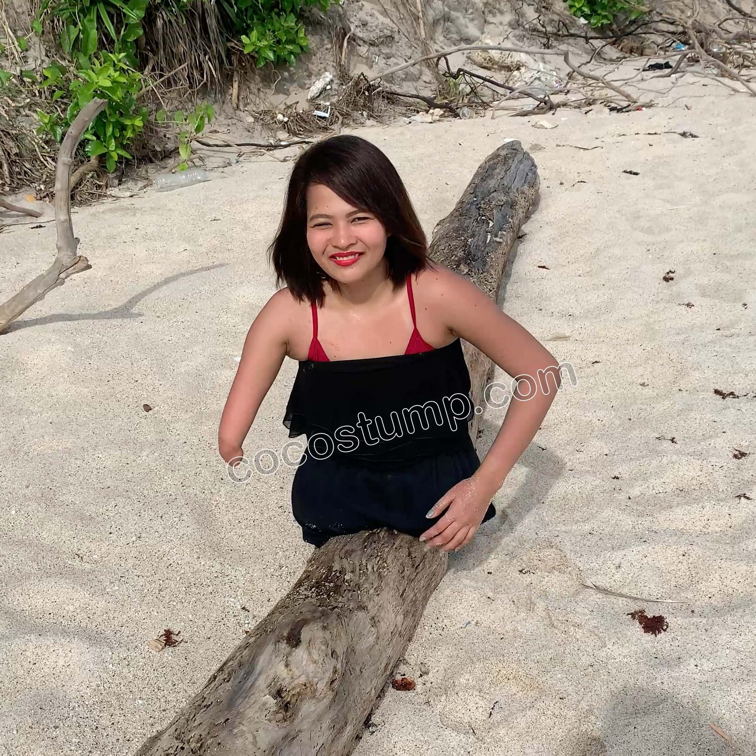 Observe the enchanting sight of Aura triple, elegantly adorned in a sleek black dress. She strolls with her distinct grace along the shoreline, delicately perched atop a weathered tree trunk as she seeks refuge in the shade. This beach is a mesmerizing paradise, its sands a pristine shade of near-white, bathed in the warm embrace of the radiant sun.