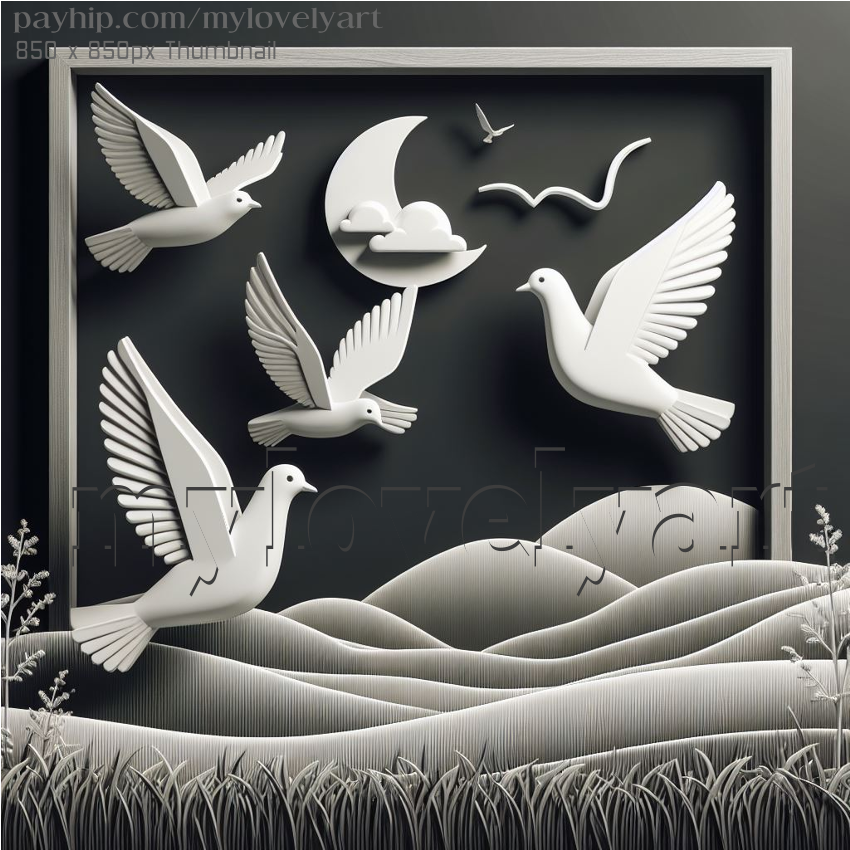 Soaring high above a hilly grassland, a fleet of white doves breaks the monochrome mold in this black, white, and gray digital art scene. #DigitalArtDivinity #AspirationsAfloat #EtherealEscorts #TraversingSkies